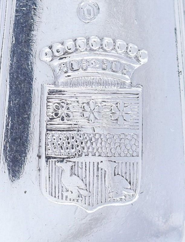 Presented is an exceptional quality PAIR of Dutch first standard silver table, serving, or large oval soup spoons. These spoons date to 1873/1874 and were made by Kempen & Zoon, a renowned Dutch maker that is still active today. The spoons are a full continental dinner size, which is hard to find today. The pattern is a classic Fiddle Thread design, with a gentle upturn to the ends of the handles. On the reverse, in the European style, is a crest. The crest is separately cast and applied rather than simply engraved, a sure sign of quality and superb craftsmanship. Good resources on Dutch heraldry are hard to come by, but the presence of a fairly ornate coronet and the care in rendering the tinctures of the coat of arms (blue, gold, and red in this case) combined with the use of first standard silver suggests nobility of some sort. Please note, we have additional groups of flatware from the same original set, with the same crest, maker, pattern, etc.
