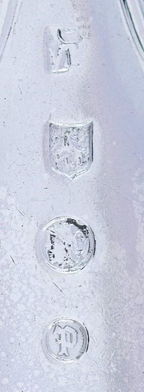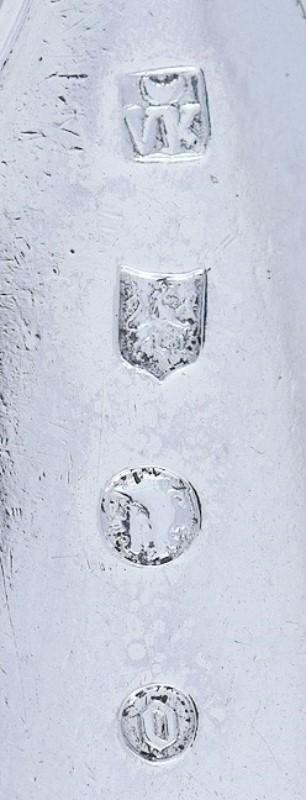 Each spoon is stamped with Dutch hallmarks: the lion rampant for first standard silver, 934 purity; the Minerva head duty stamp; a date letter of either O for 1873 or P for 1874; and a maker's mark for Fa. J.M. van Kempen & Zoon. It's worth noting that 934 is a higher purity than sterling, which is 925.