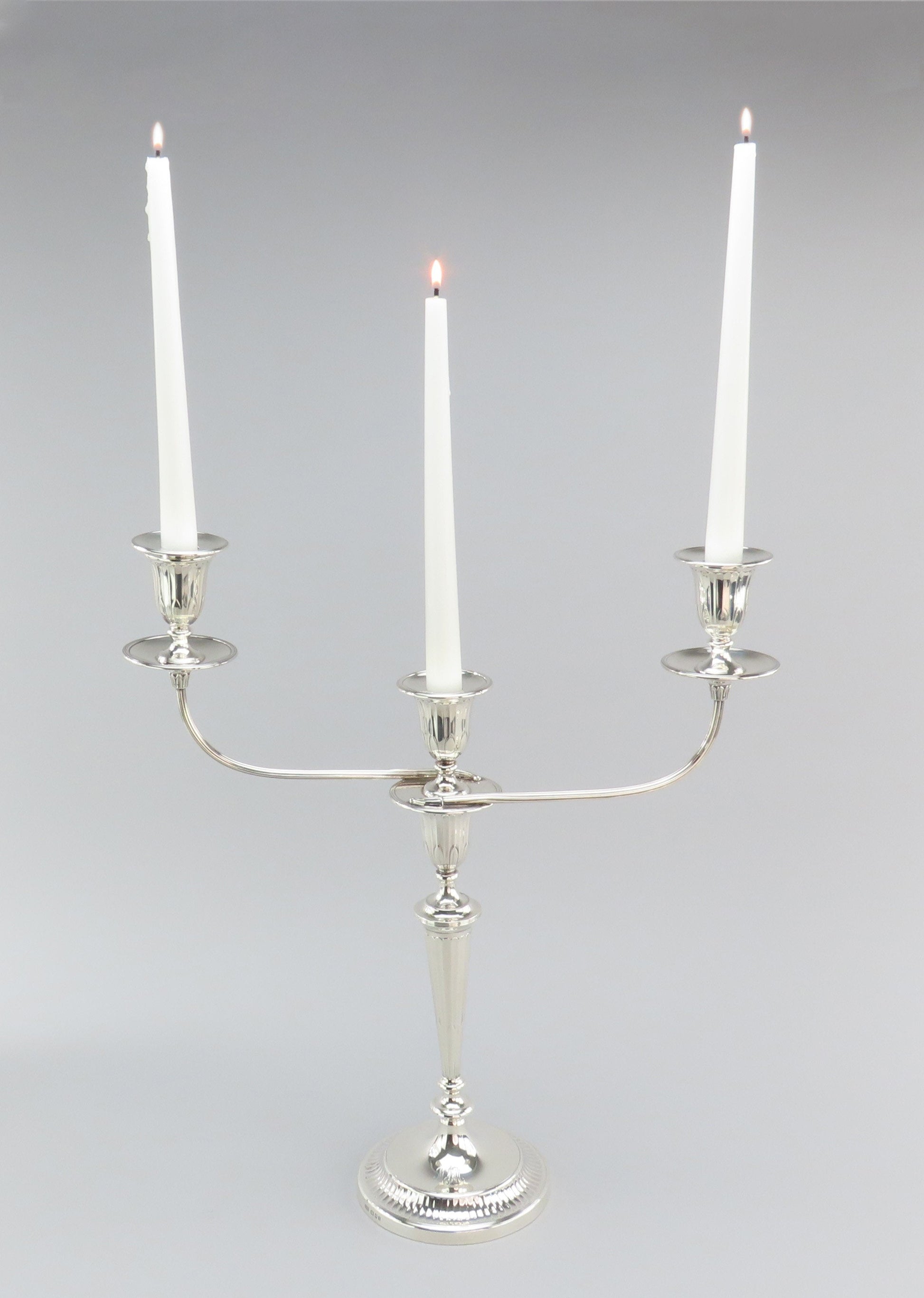 Measurements: 16 3/4 inches across the candelabra arms, 5 3/8 inches in diameter at base, and about 18 inches tall