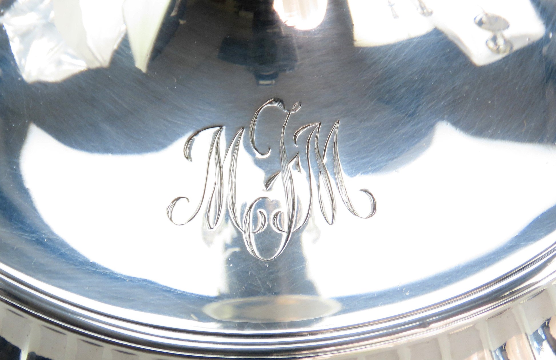 Presented is large pair of English sterling silver three light convertible candelabra. These candelabra were made by the Crichton Brothers and date to 1931. The candelabra have a reeded design to the arms, and an elegant swirl in the way they join the central socle. The shafts have a stylized paneled/petal design, while the socles are done in a stylized blossom form, though the effect is subtle. Each socle has a removable wax drip/bobeche, for ease of cleaning. The candelabra arms are removable so the pair can be used as single candlesticks. The base of each one is monogrammed “MFM” in flowing script. These candelabra came from the Vanderbilt estate, but we were unable to identify the person whose monogram this is.