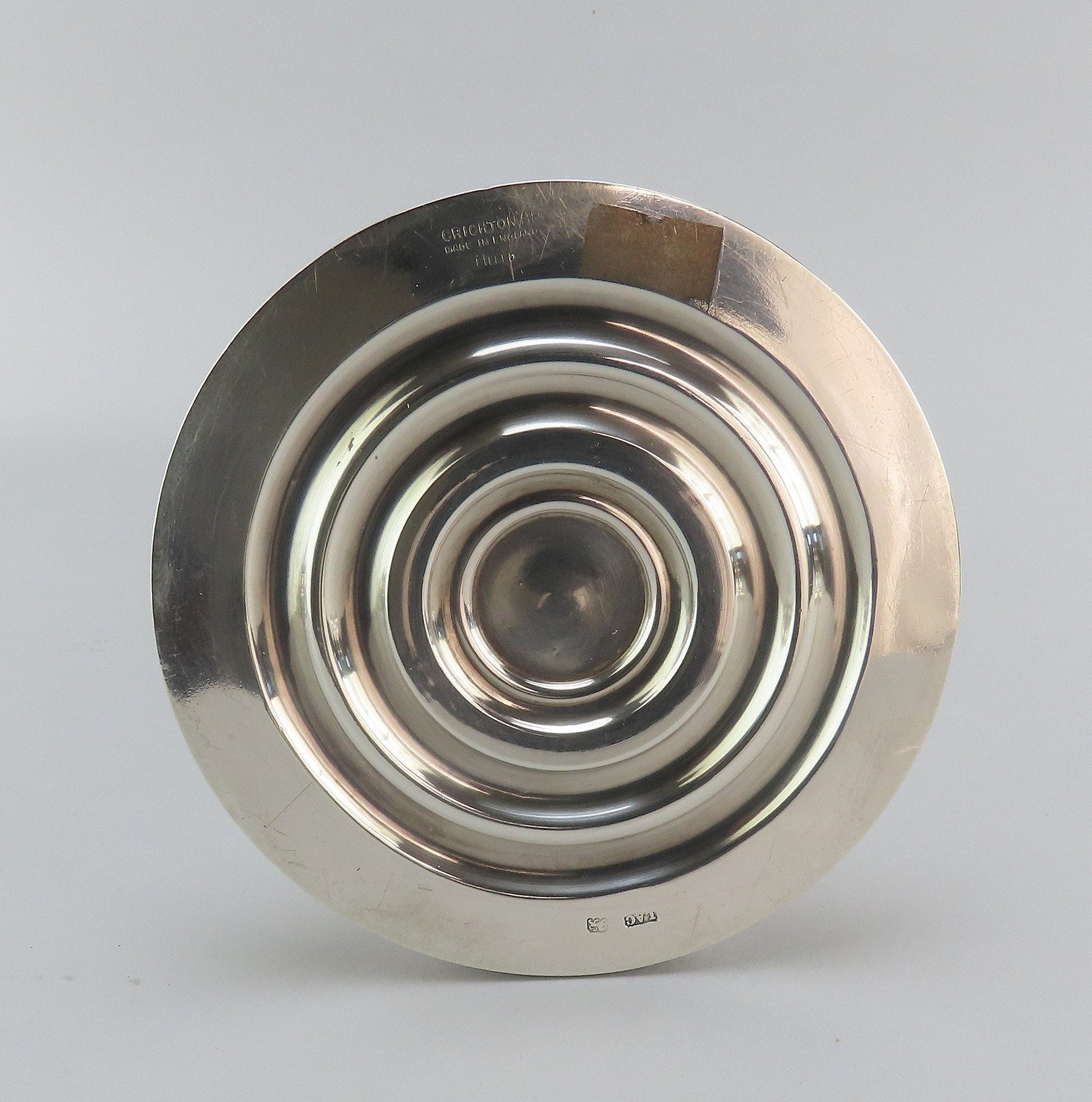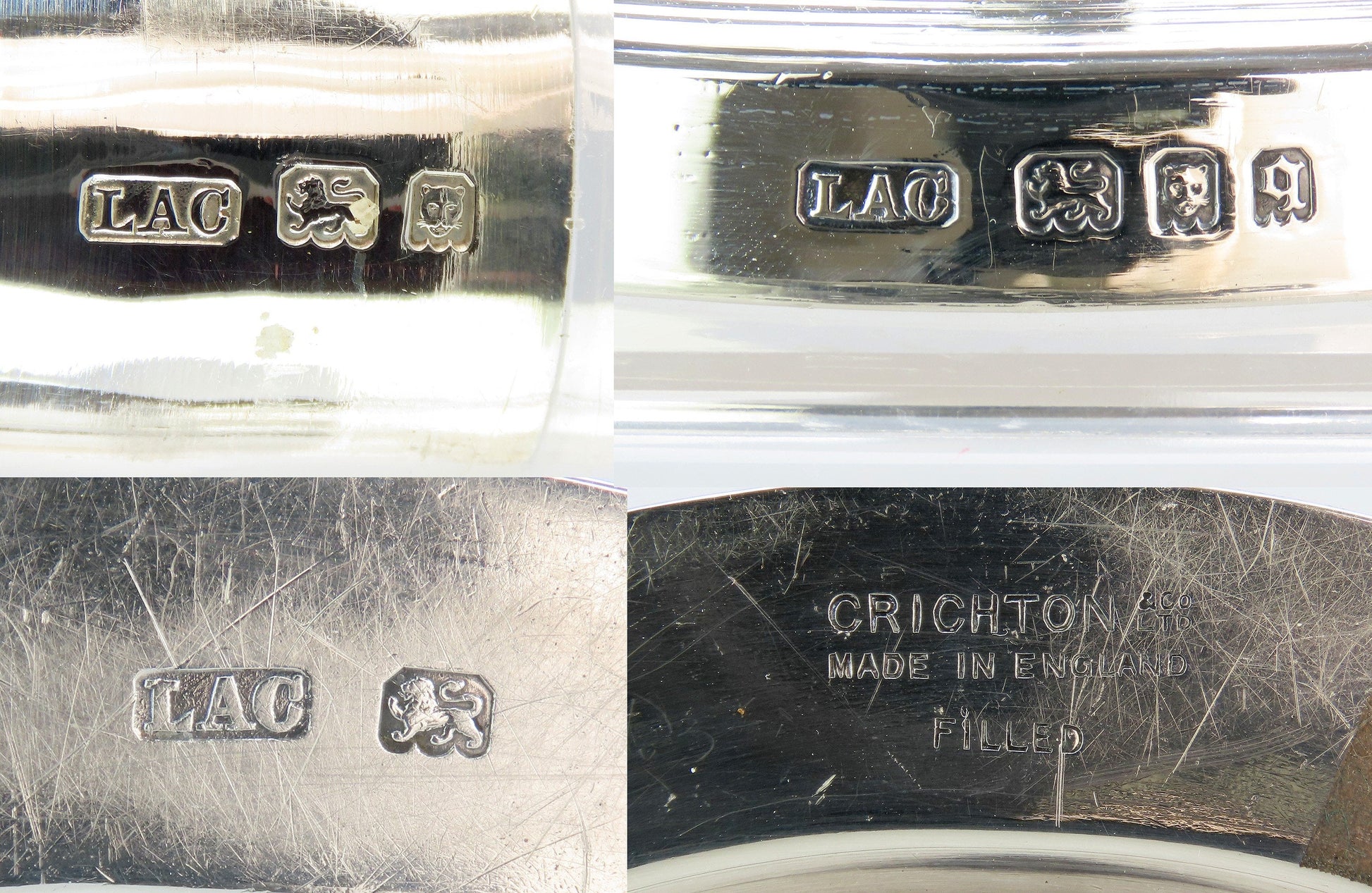 The base is hallmarked on the side with English hallmarks: the lion passant for sterling silver, the leopard's head for London, and the date letter Q representing 1931. The pair is also marked with the maker's mark for Crichton Brothers. These hallmarks are replicated over all the different pieces. All hallmarks match.