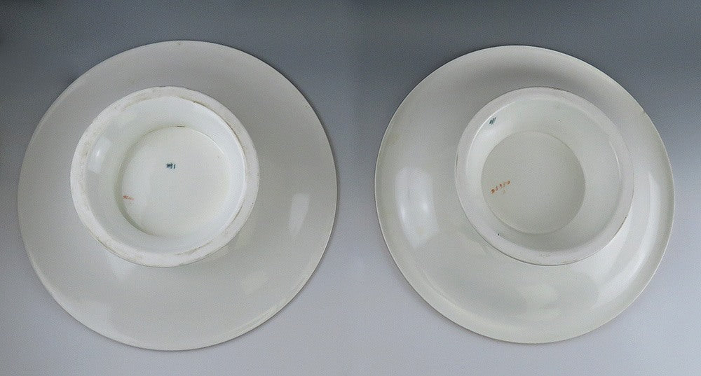 The underside of each stand bears the W. T. Copeland of Stoke-on-Trent England maker's mark indicating the date of the piece to be between 1851 and 1885. There is also a hand-written identifying number in red.