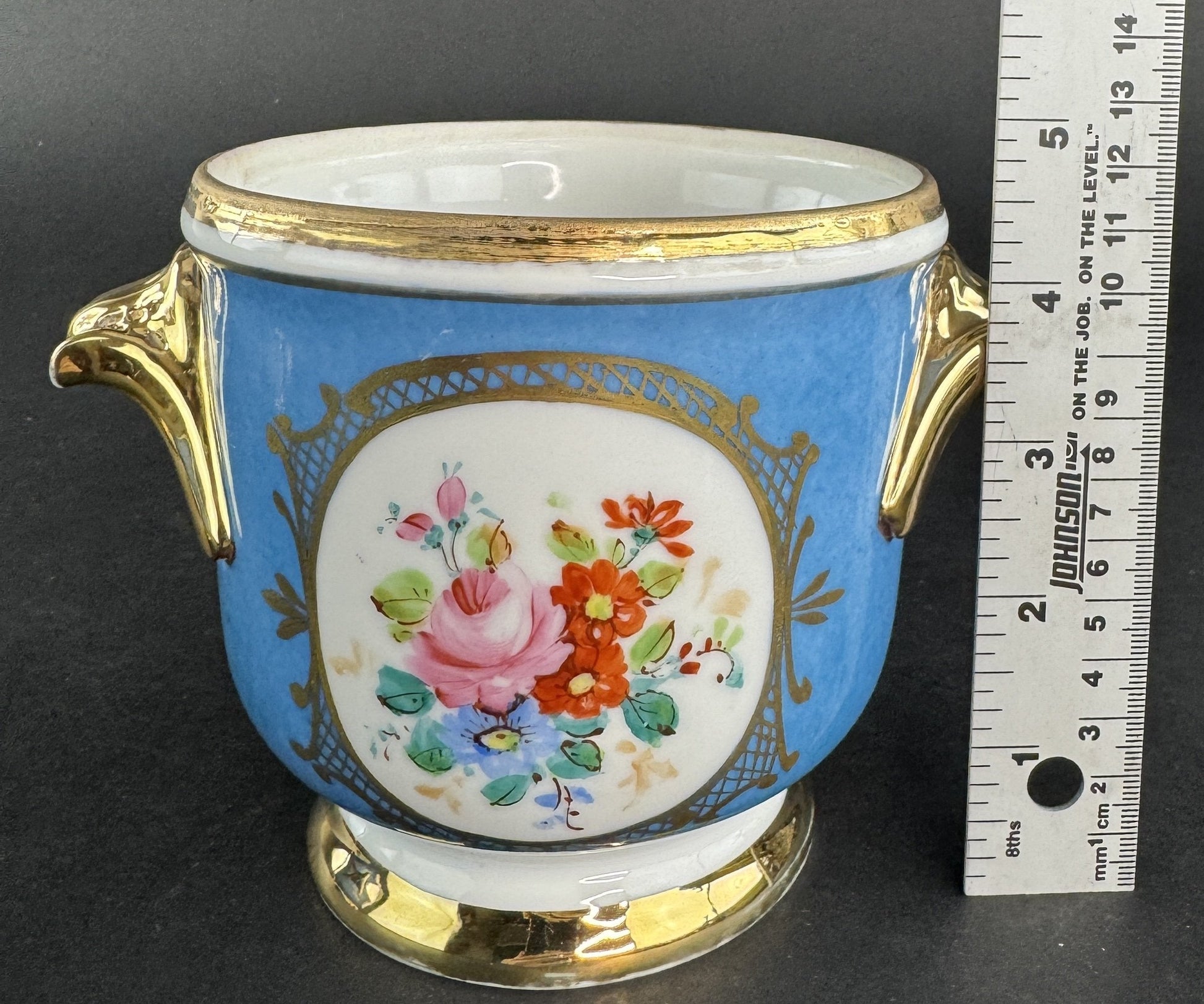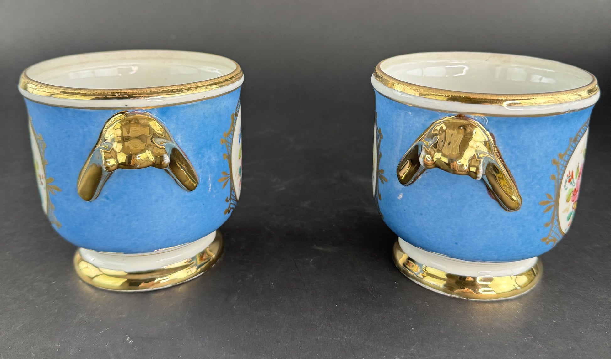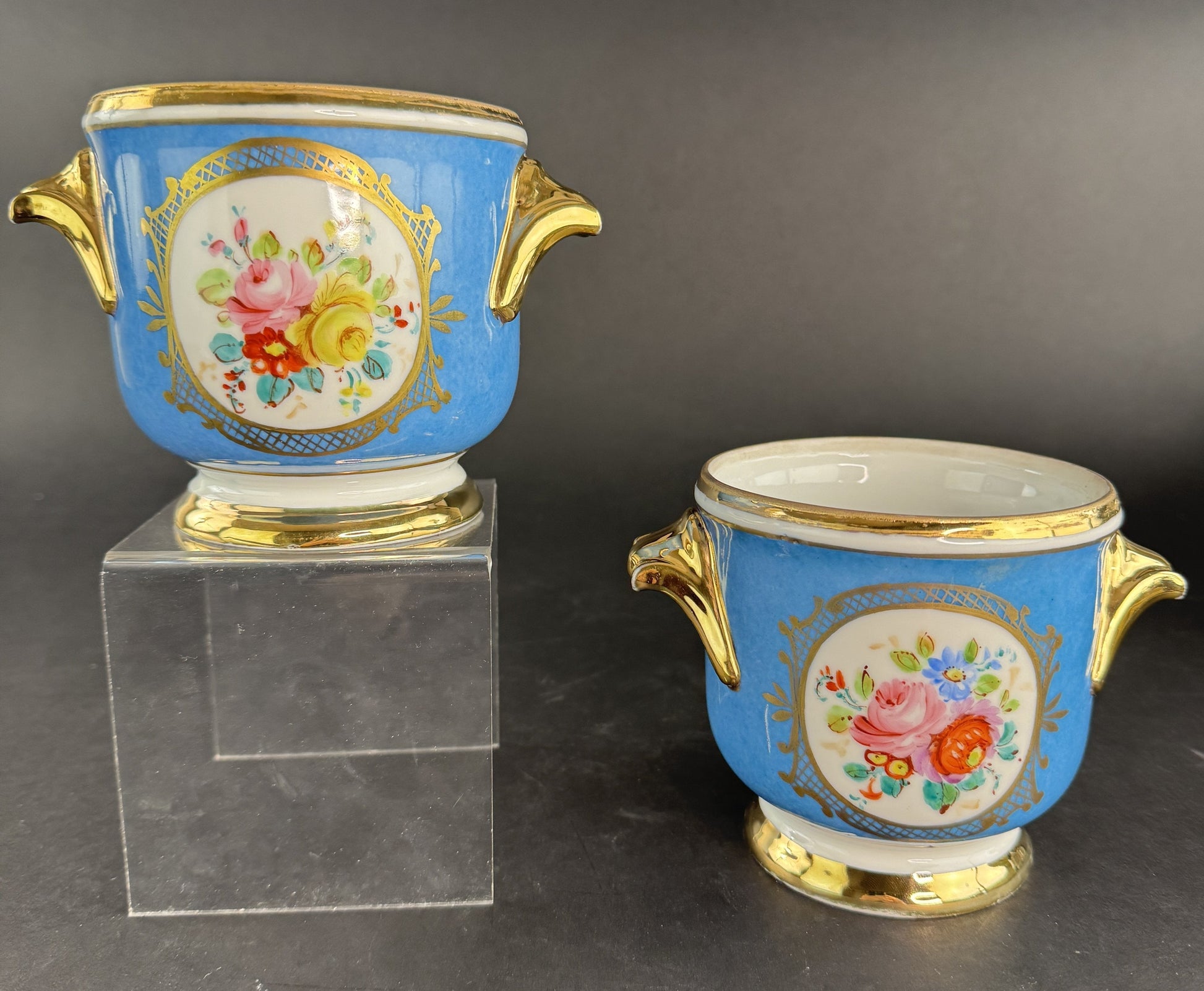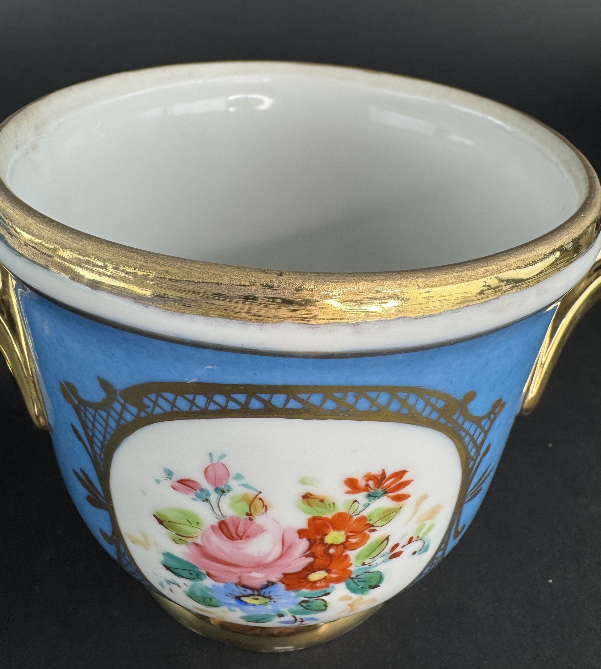 Pair Antique French Blue Gilt Floral Porcelain Planters Cache Pots Jardinieres