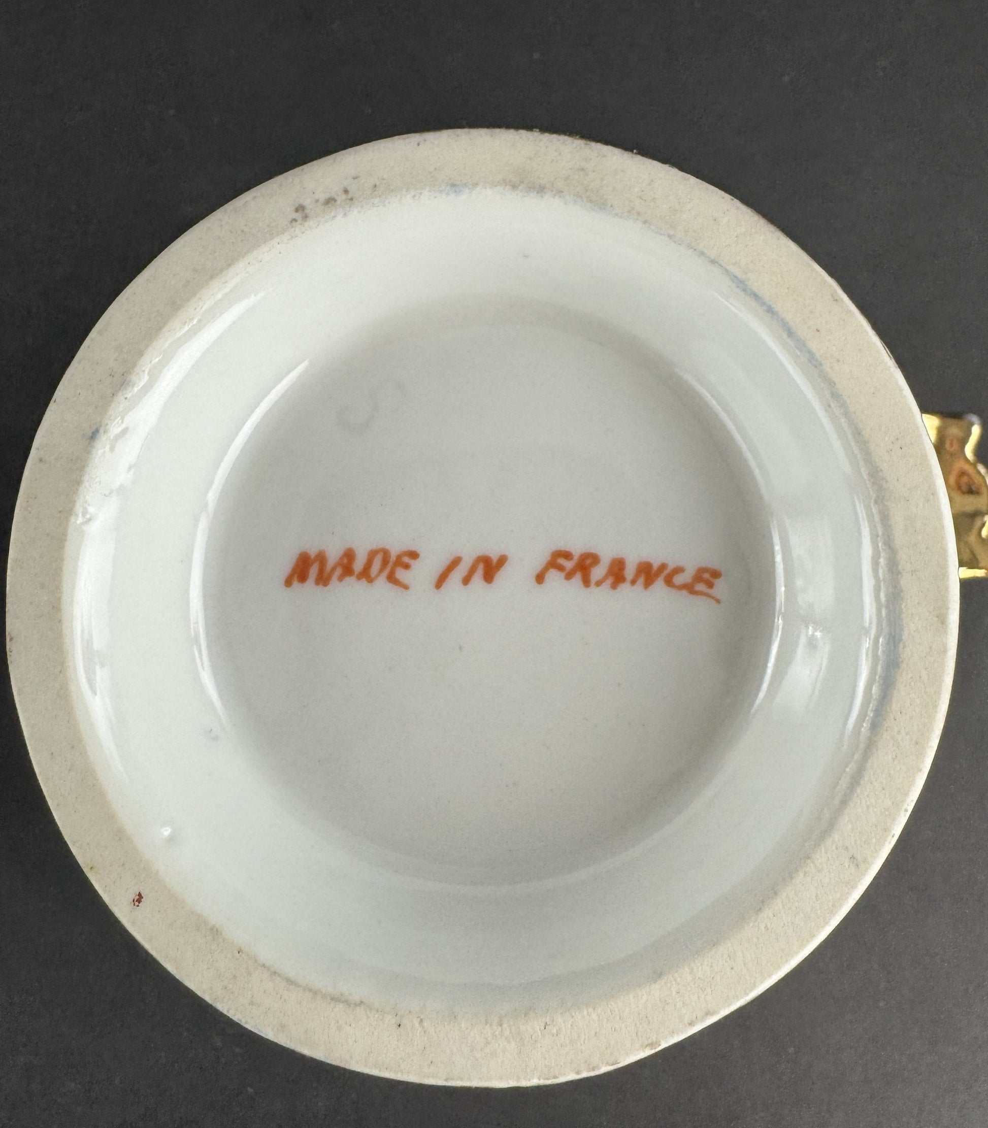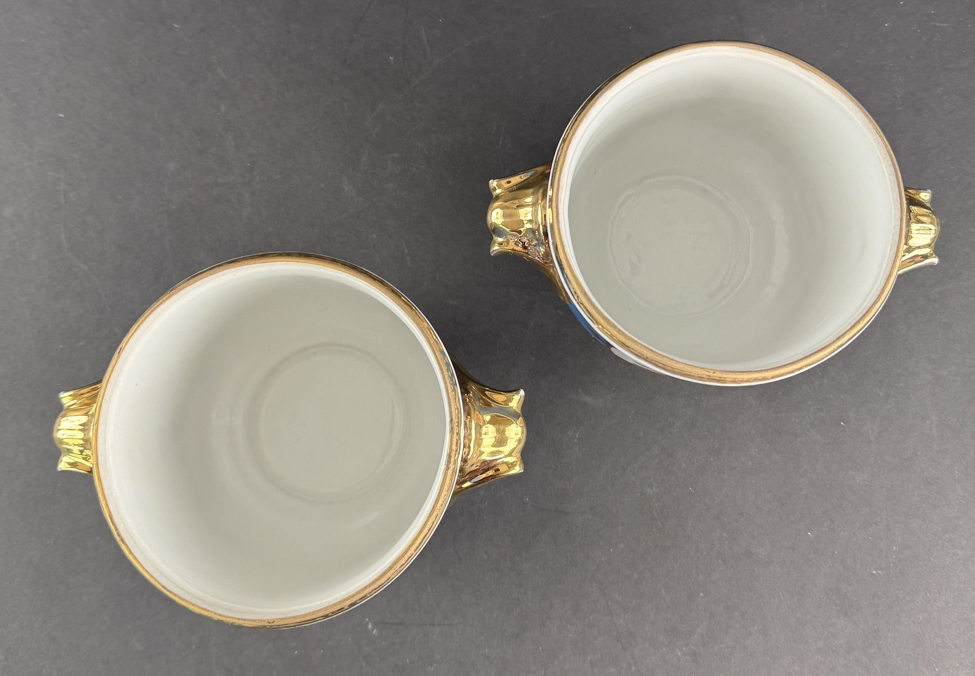 These cache pots are in excellent overall condition. There is some wear or something of a reaction to the gilding along the rim, but they don't appear to have been re-gilded or restored. There are no chips, no cracks, no breaks, and no repairs.