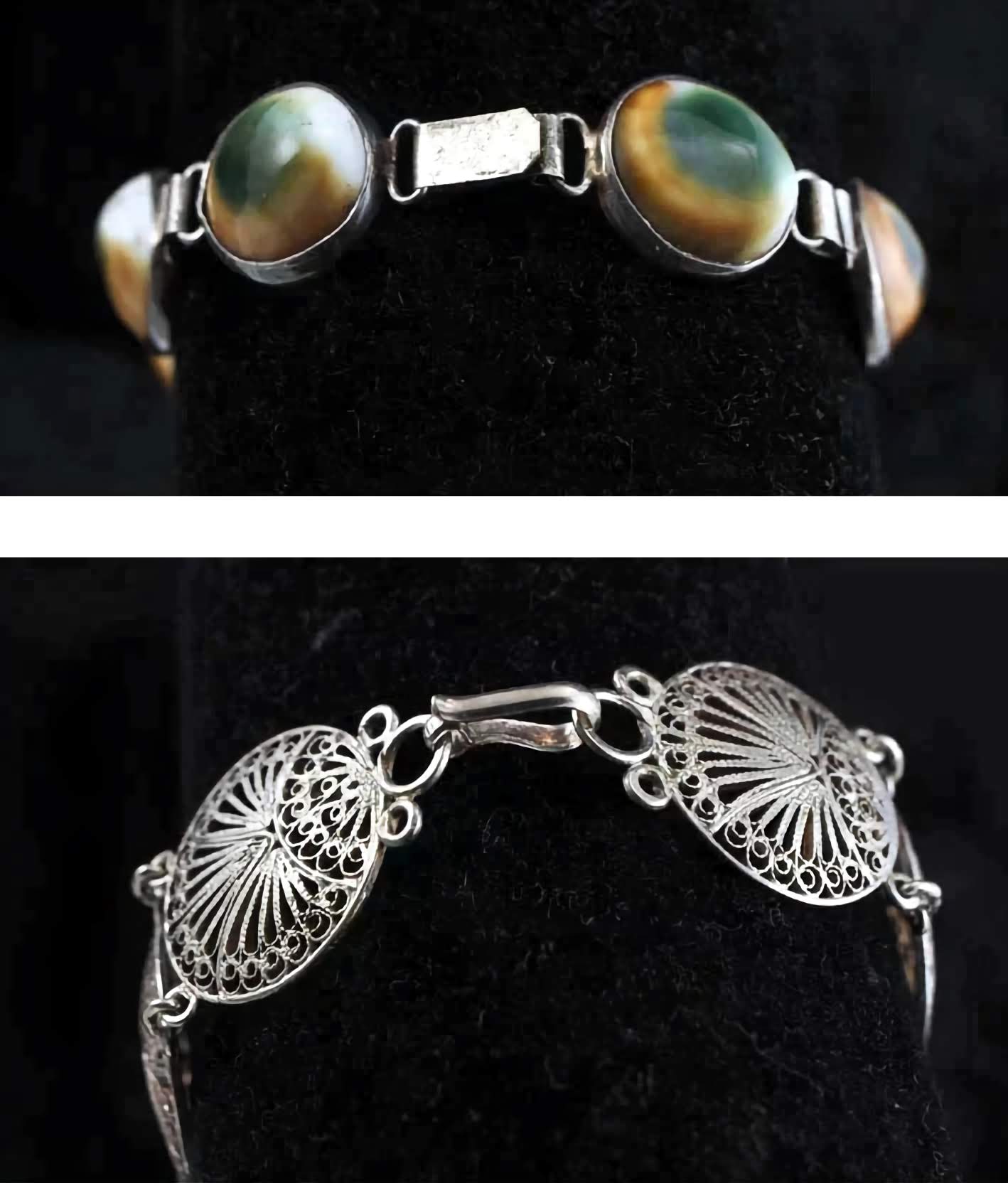 Pair Bracelets 800 Silver Filigree and Green Shell