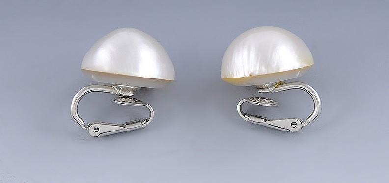 ears. Each earring is mounted with a half of a large mabe pearl. The pearls
