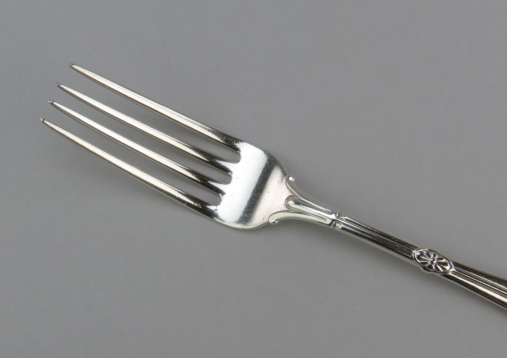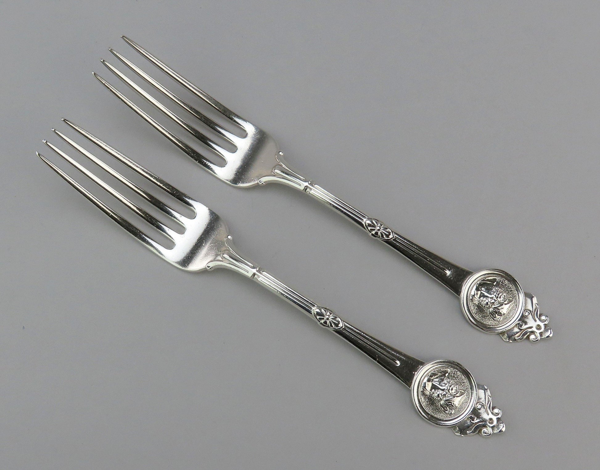 These forks are in great condition. The medallion designs are nice and crisp. There are no splits, no breaks, no dents, no monogram removals, and no repairs.
