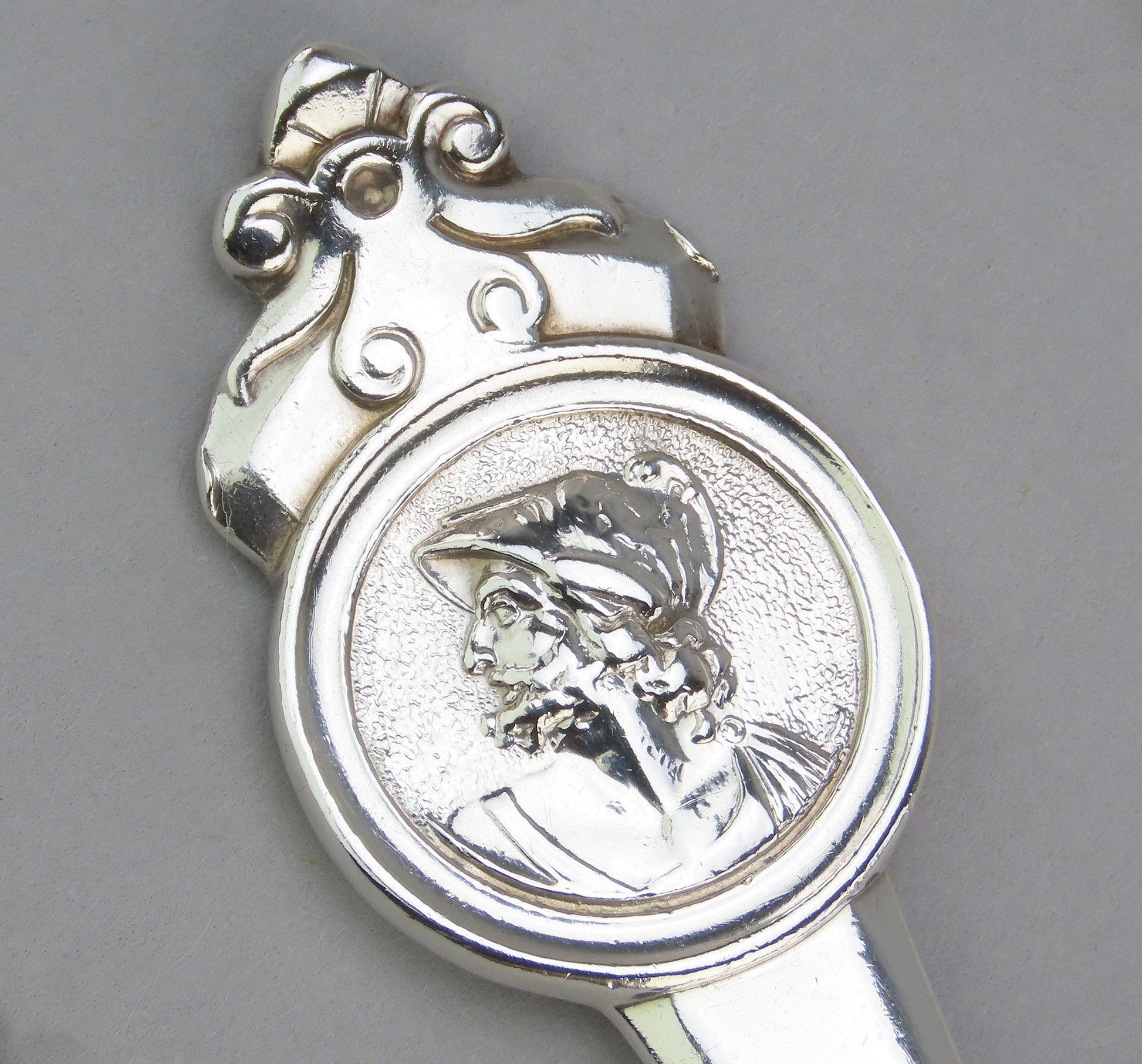 Presented is a lovely pair of Gorham sterling silver dinner forks. These forks are made in the Medallion pattern, which was patented in 1864. As the name suggests, this pattern features bold designs of classical Greco-Roman profiles in medallions on the handles. These forks have the profile of a helmeted warrior. The forks are monogrammed JEJ in flowing script on the back of the handle.