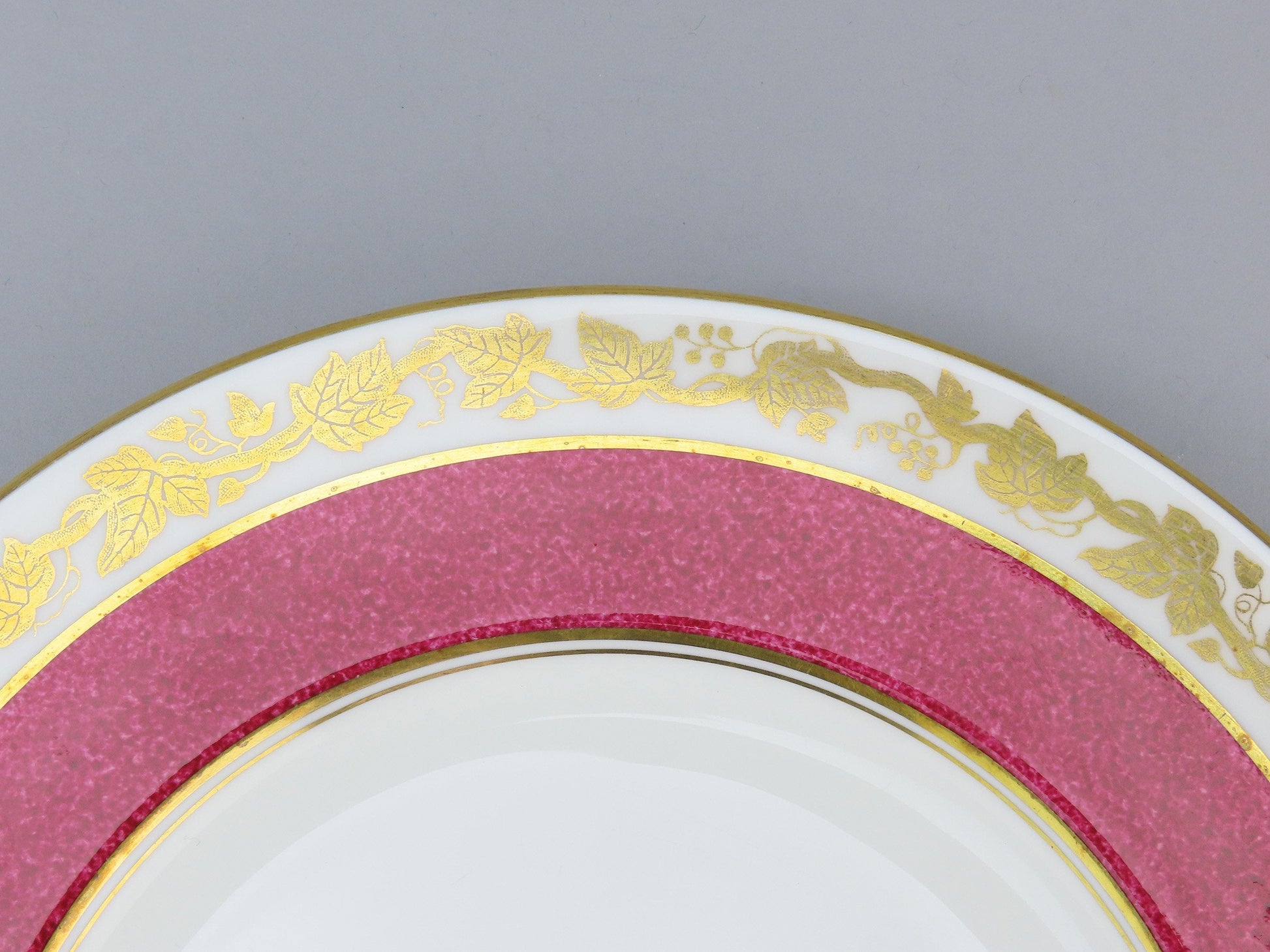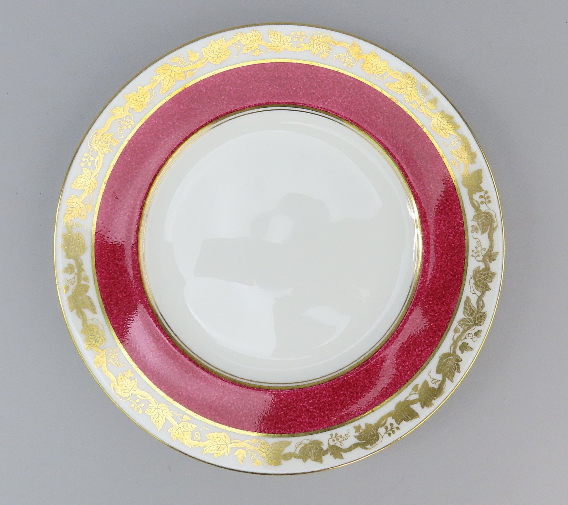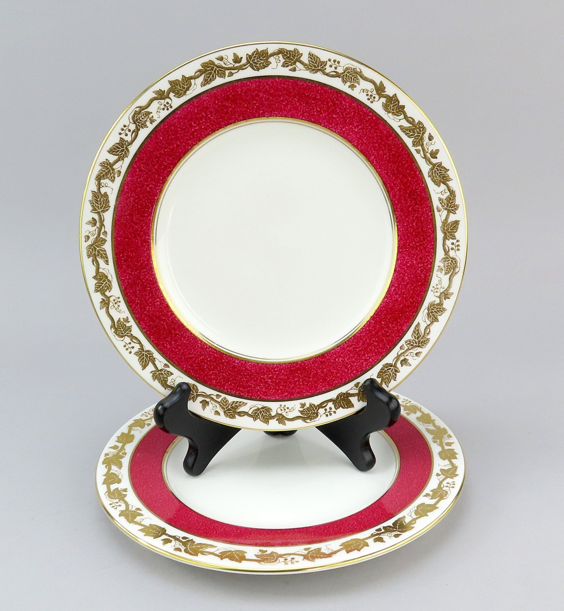 Presented is a lovely pair of bone china luncheon plates from Wedgwood. This piece is in the Whitehall pattern, which was produced between 1945-1987. The pattern displays gilded grape clusters and leaves in a border around the piece. This version of Whitehall has a powder ruby band around the border as well.