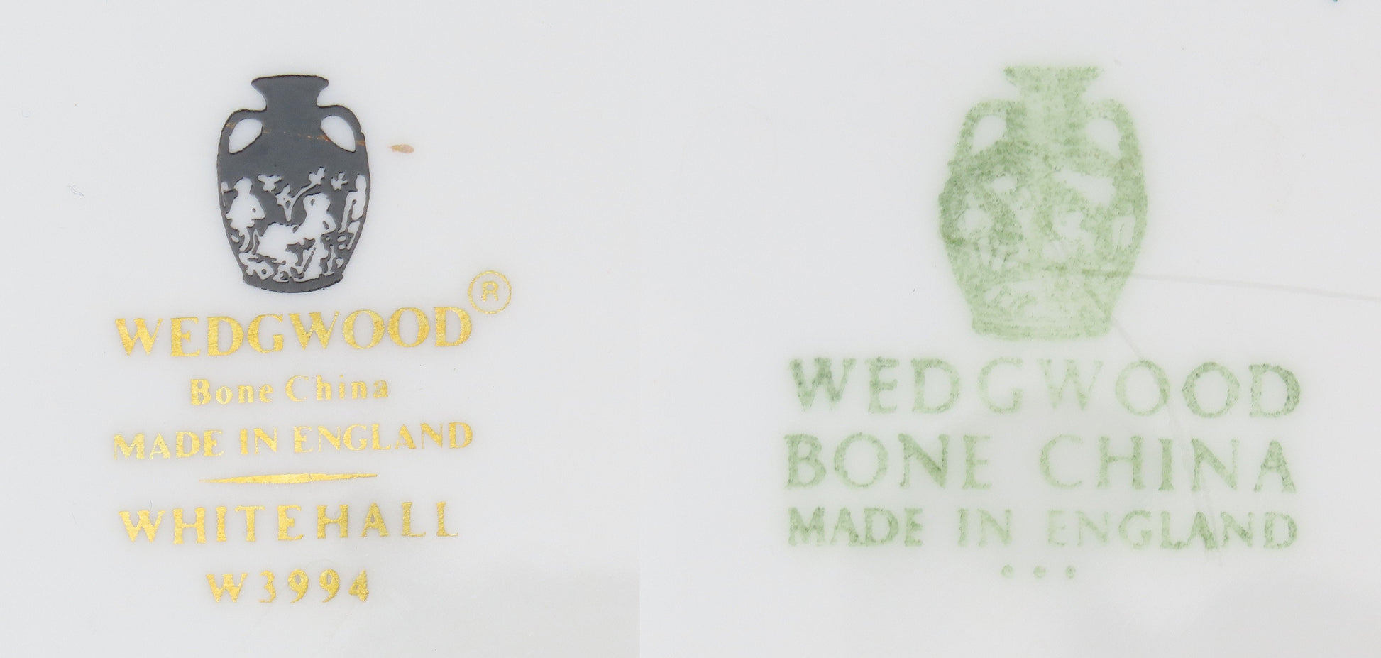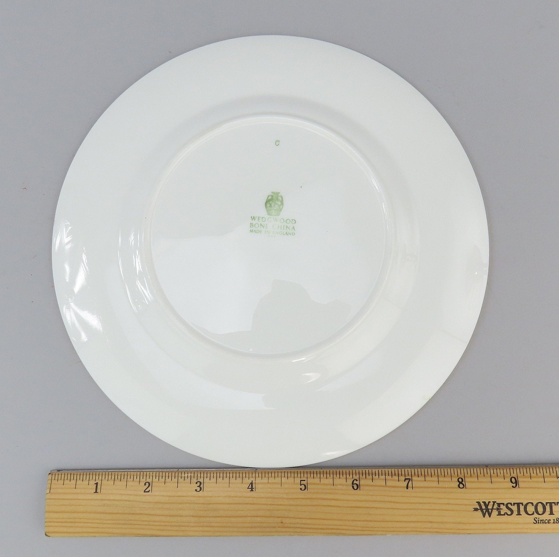 The underside of each plate is marked with the maker's mark for Wedgwood. It is also marked Bone China, “Made in England”. One of the plates is marked with the pattern name. We have other pieces in this pattern. We encourage you to view our page or reach out if you are interested in more of this collection.