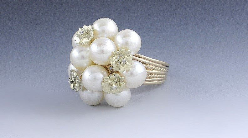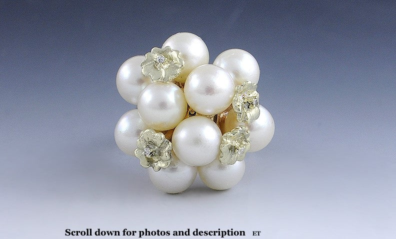 Presented is an eye-catching, diamond and pearl floral 14 karat yellow gold cluster ring. The top of the ring is post set with a large cluster of lovely pearls. Among the pearls are four gold flowers, each topped with a diamond. The largest pearl measures 8.22 millimeters in diameter. The gold band is done in a neat, gold wire and rope twist design.