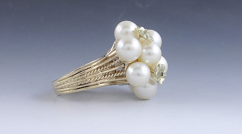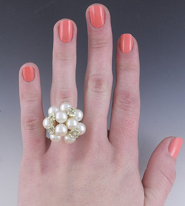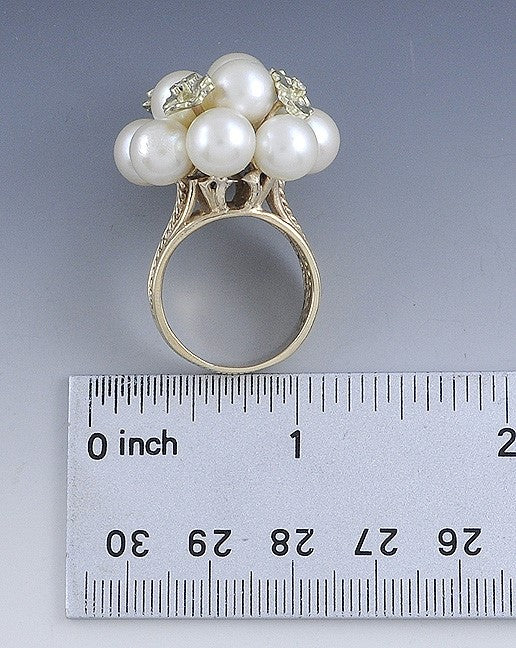Pearl & Diamond Floral 10K Yellow Gold Cluster Ring Size 8