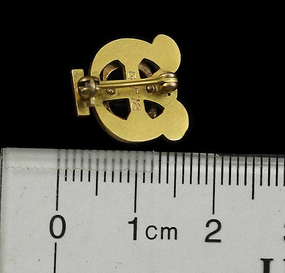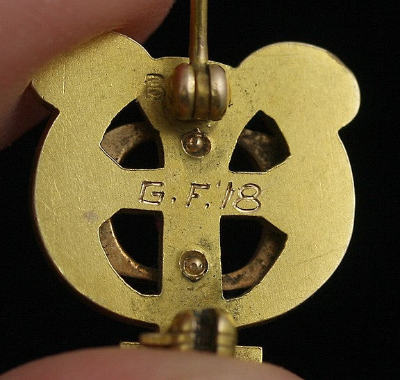at the center. The back of the pin is engraved G.F. ’18 for 1918.