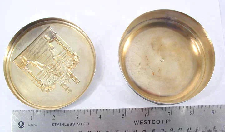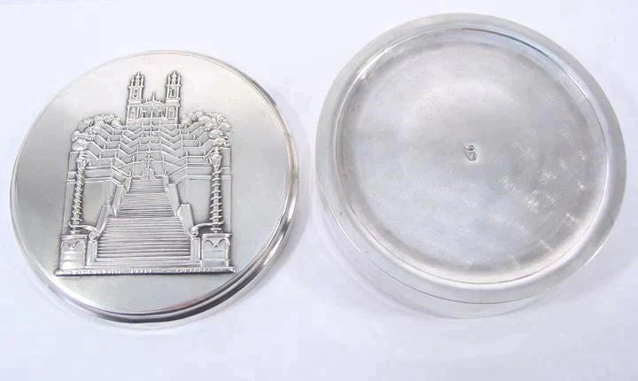 Presented is a great silver box from the Bom Jesus Do Monte religious sanctuary in Portugal. This box is a simple round covered box except that it has a raised image of the sanctuary on the top. The bottom of the image has the name Bom Jesus Do Monte, Braga, and Portugal. The detail on the image is quite good and accurate. The steep steps with the chapels for the stations of the cross and the church at the top are beautifully rendered. The interior of the box has a lovely gold wash.