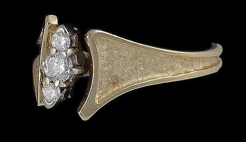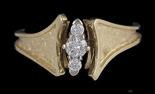 Presented is a lovely little 14K gold ring topped with three modern round brilliant cut diamonds. The two smaller diamonds on either end are about 3-4 points in size each, while the larger center stone is about 15 points. We estimate the total diamond weight to be around 22 points or just under 1/4 carat. The center diamond measures approximately 3.5 millimeters in size. The diamonds are eye clean. They have G-H color and SI1 clarity. The stones are securely mounted in a beautifully textured yellow gold setting. The ring is fairly modern.