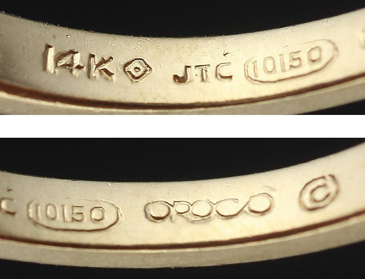 The ring is marked on the interior of the band with 14K and a maker’s mark. We have tested it with nitric acid and guarantee it to be 14K gold.