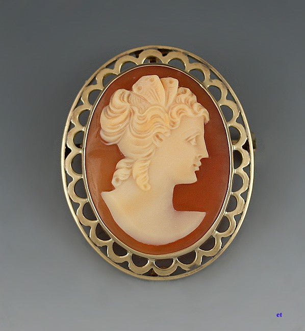 Pretty 14K Yellow Gold Openwork Hand Carved Cameo of a Young Woman Pin Pendant