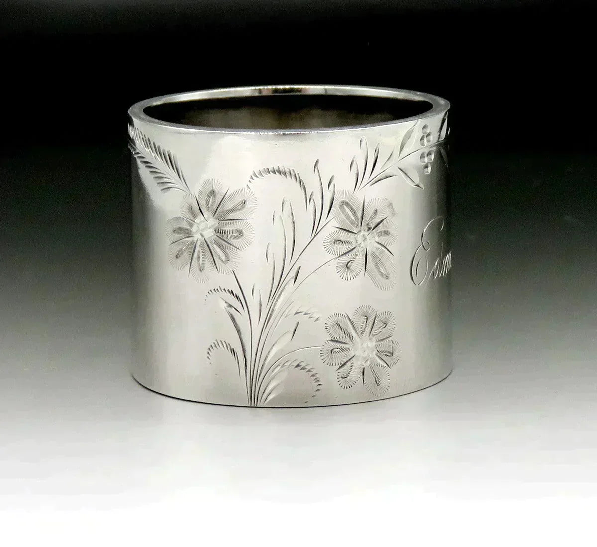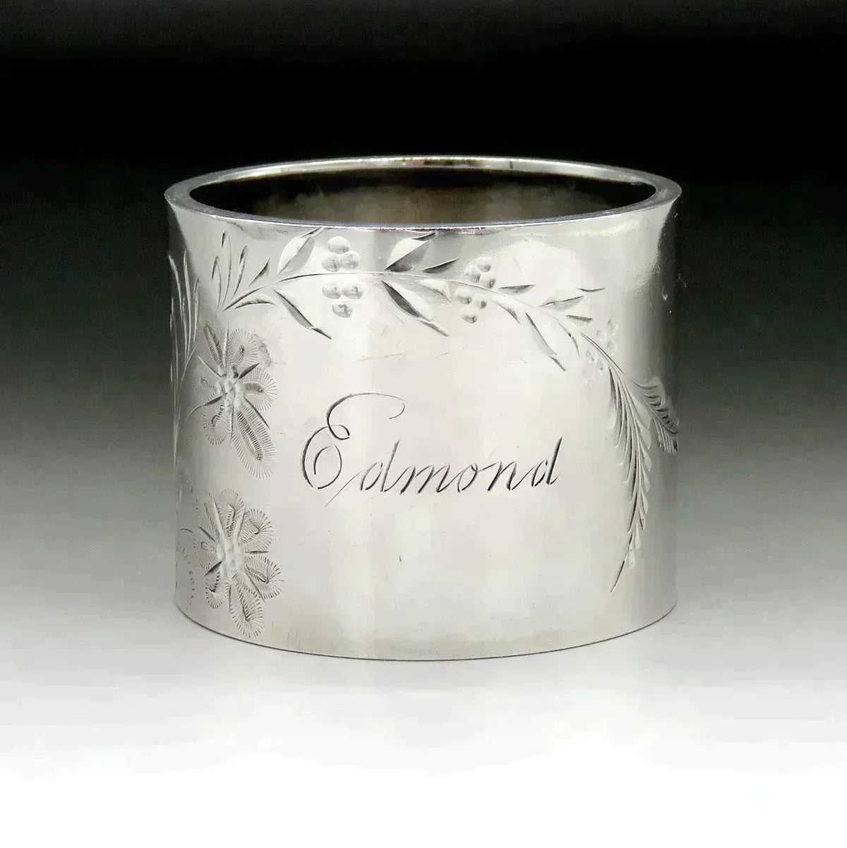 Presented is an antique, American sterling silver napkin ring made between 1880 to the 1890s. This Victorian piece is beautifully hand engraved with bright cut style flowers and leaves. The front has a monogram of the name Edmond.