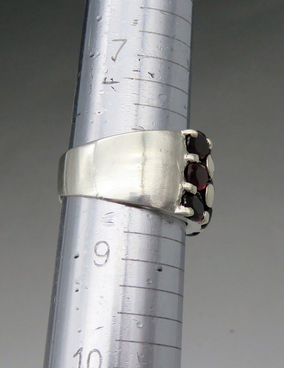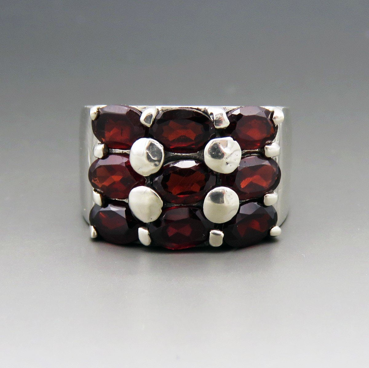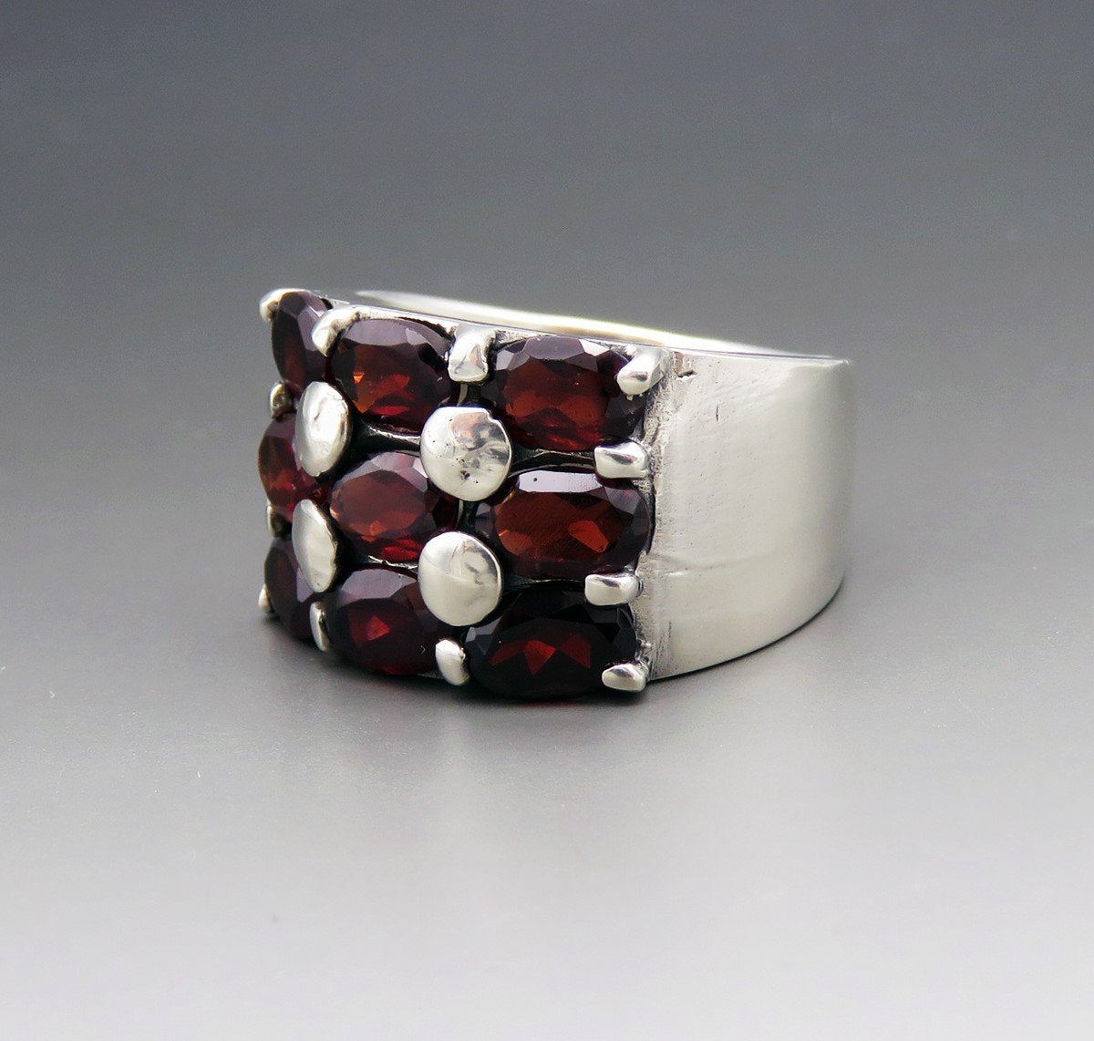 Presented is a wide, sterling silver and natural garnet gemstone ring. This handcrafted piece is approximately 12.3 millimeters at its widest. The top is securely prong set with 9 faceted garnet gemstones. Each stone measures approximately 6.2 by 4.4 by 2.4 millimeters. There is about 4 + carats in total gemstone weight.
