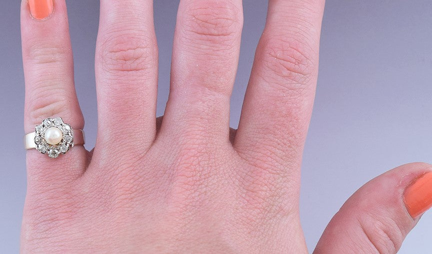 Pretty Antique 19th Century 18K Gold Mine Cut Diamond & Natural Pearl Halo Ring