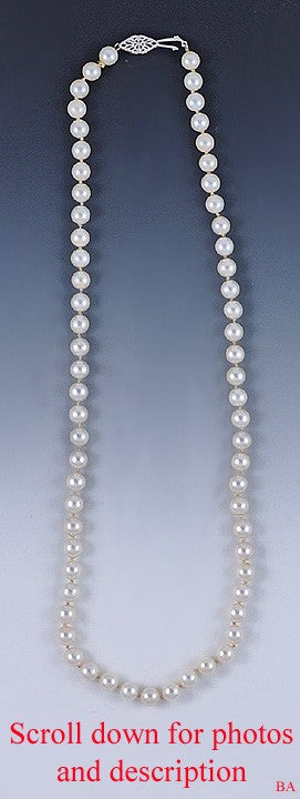 Presented is a nice quality strand of pearls made in America during the 1930s-50s. The strand is individually knotted, to keep each pearl in place. The pearls measure approximately 6.4 millimeters in diameter. The secure, hook and plunger style clasp is done in 14 karat white gold and is very decorative. The necklace hangs well, as you can see in the second photograph below.