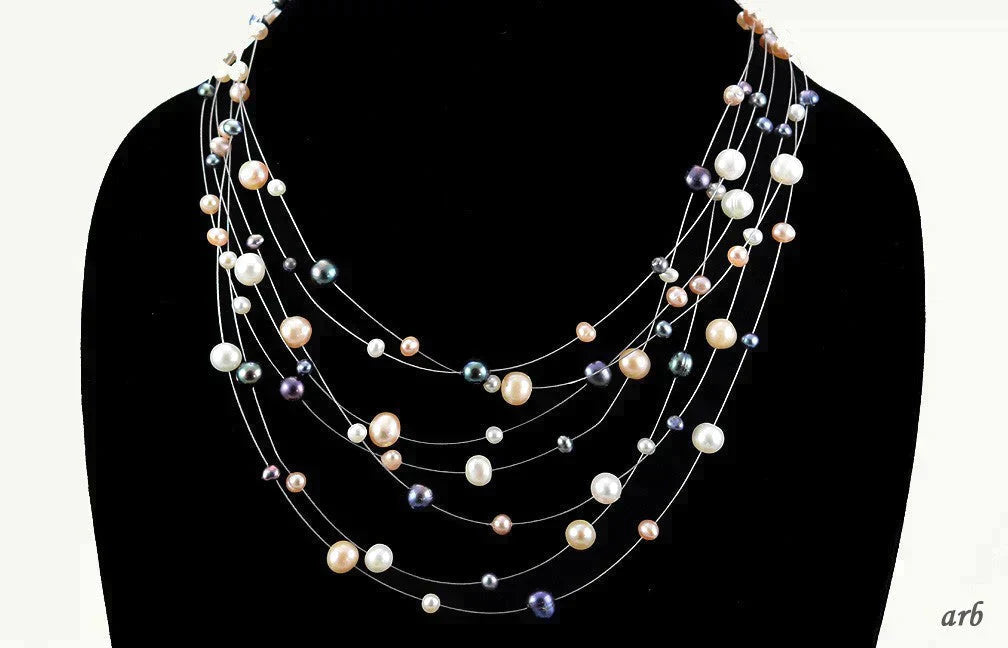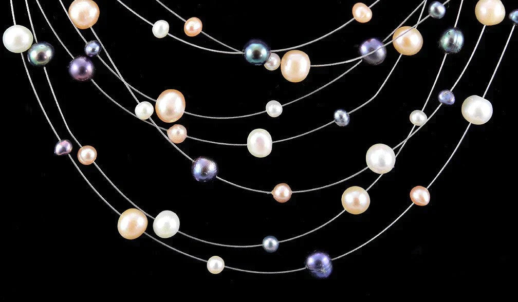 Pretty Necklace of Real Colored Pearls and Silvery Wire w/ Sterling Silver Clasp
