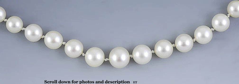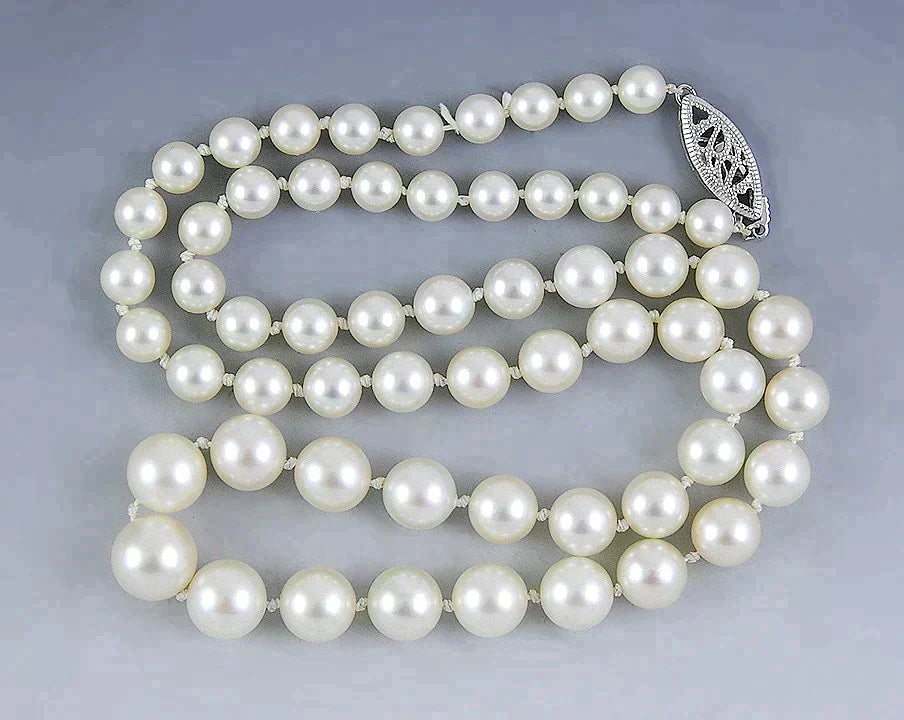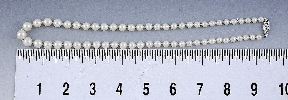 Presented is a terrific pearl and 10 karat white gold necklace. The strand consists of individually knotted genuine pearls that are graduated in size. The pearls have a nice sheen and are good quality. The pearls measure between 5.5 and 9.8 millimeters in diameter. The 10 karat white gold, plunger style clasp is done in a filigree form and is very secure.