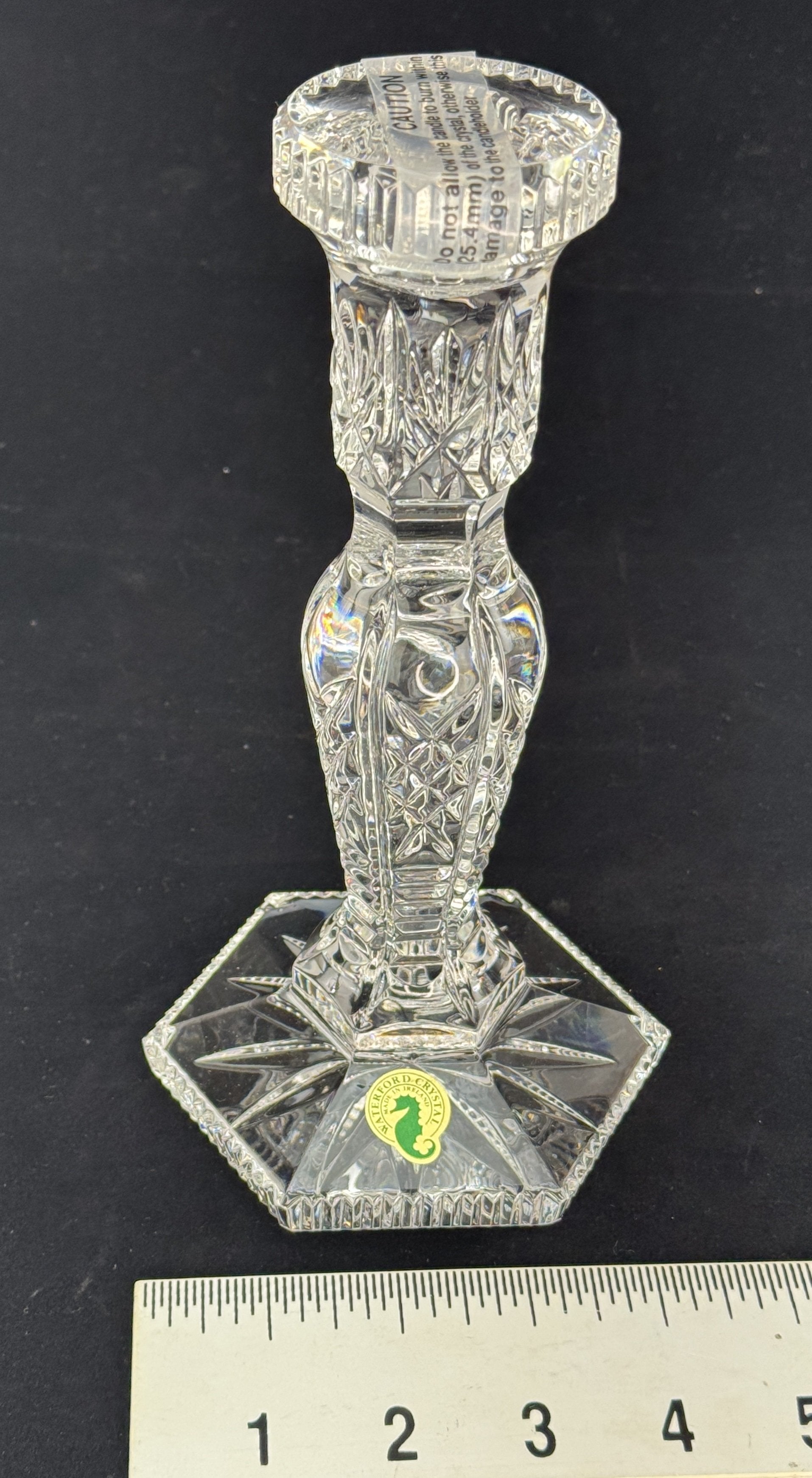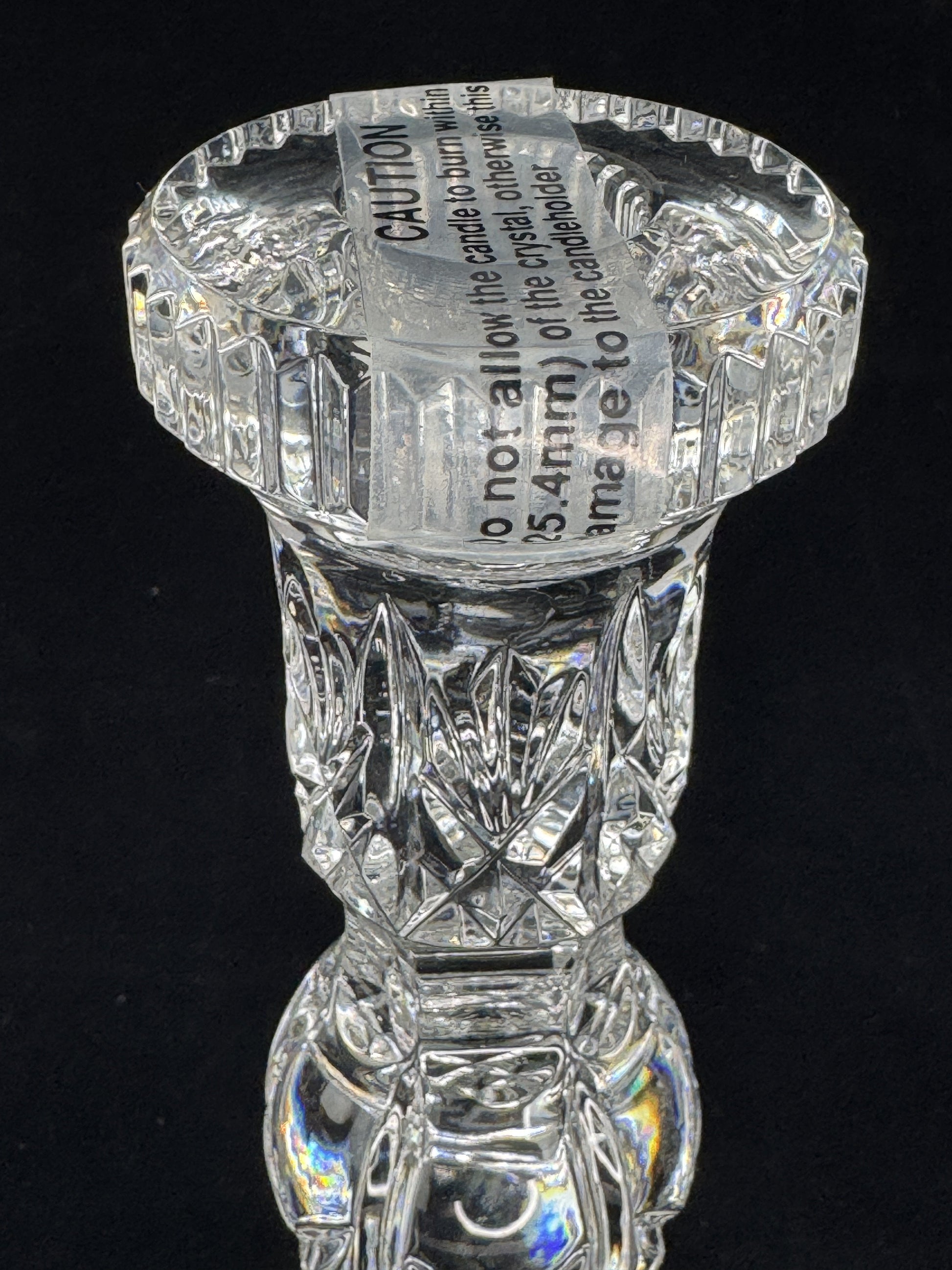 The candlesticks are signed with the Waterford mark on the underside, and also have their original barcode sticker as well as the 'Waterford Crystal Made in Ireland' seahorse sticker on the upper side of the foot. Even the socles are covered with a 'caution sticker' warning users not to allow candles to burn down less than one inch above the glass.