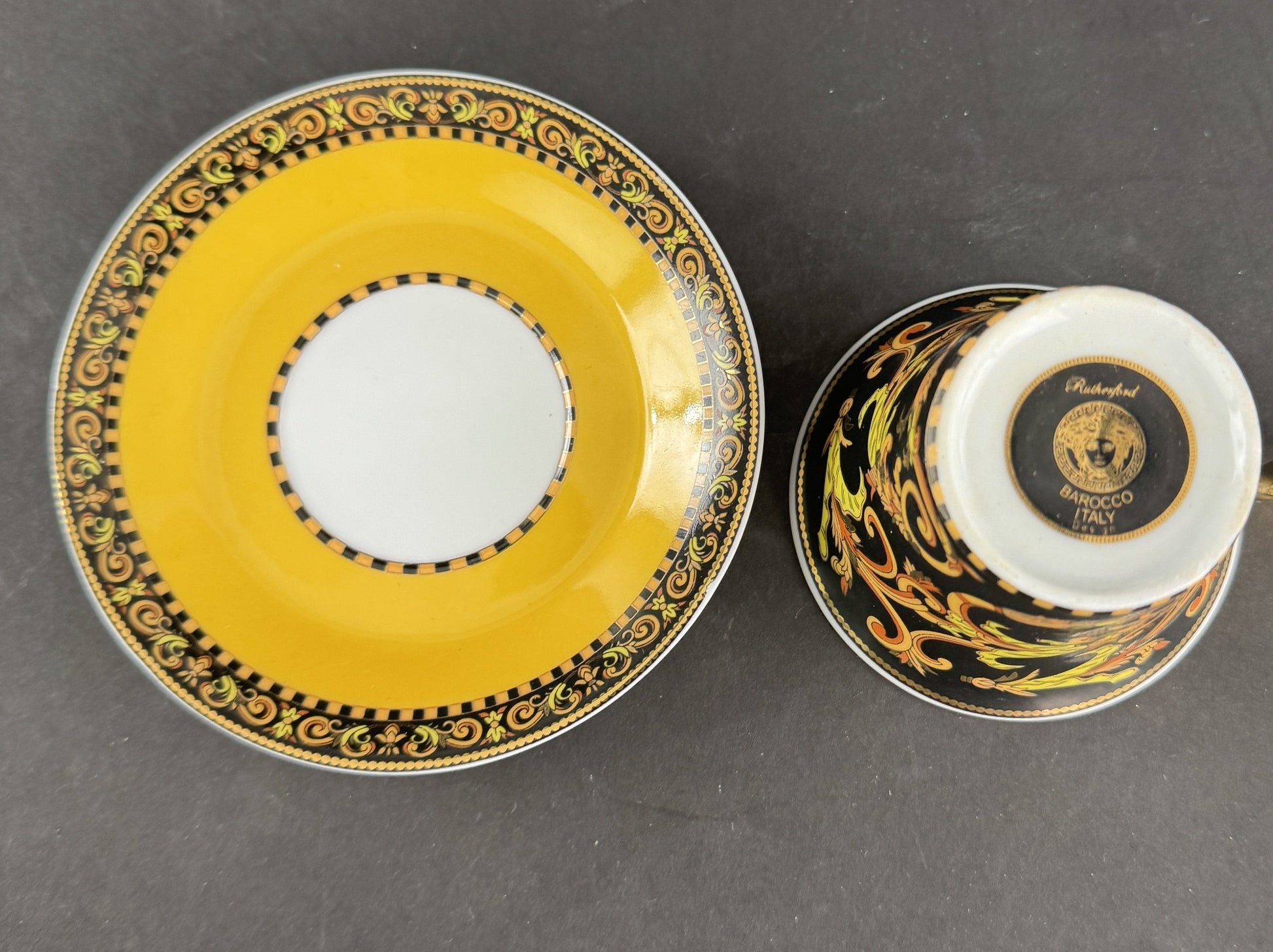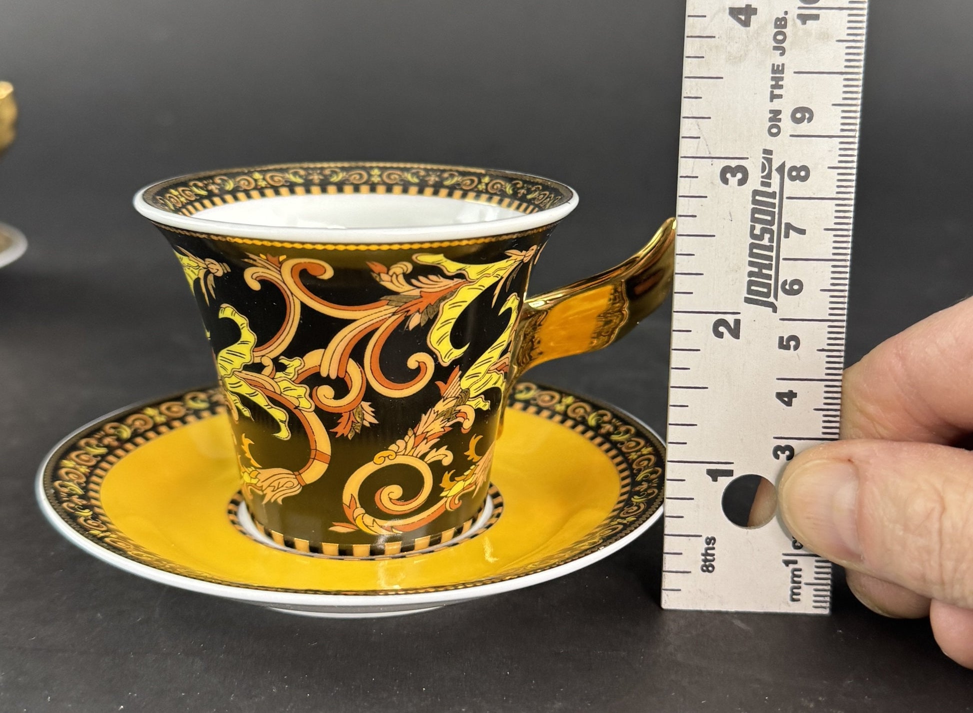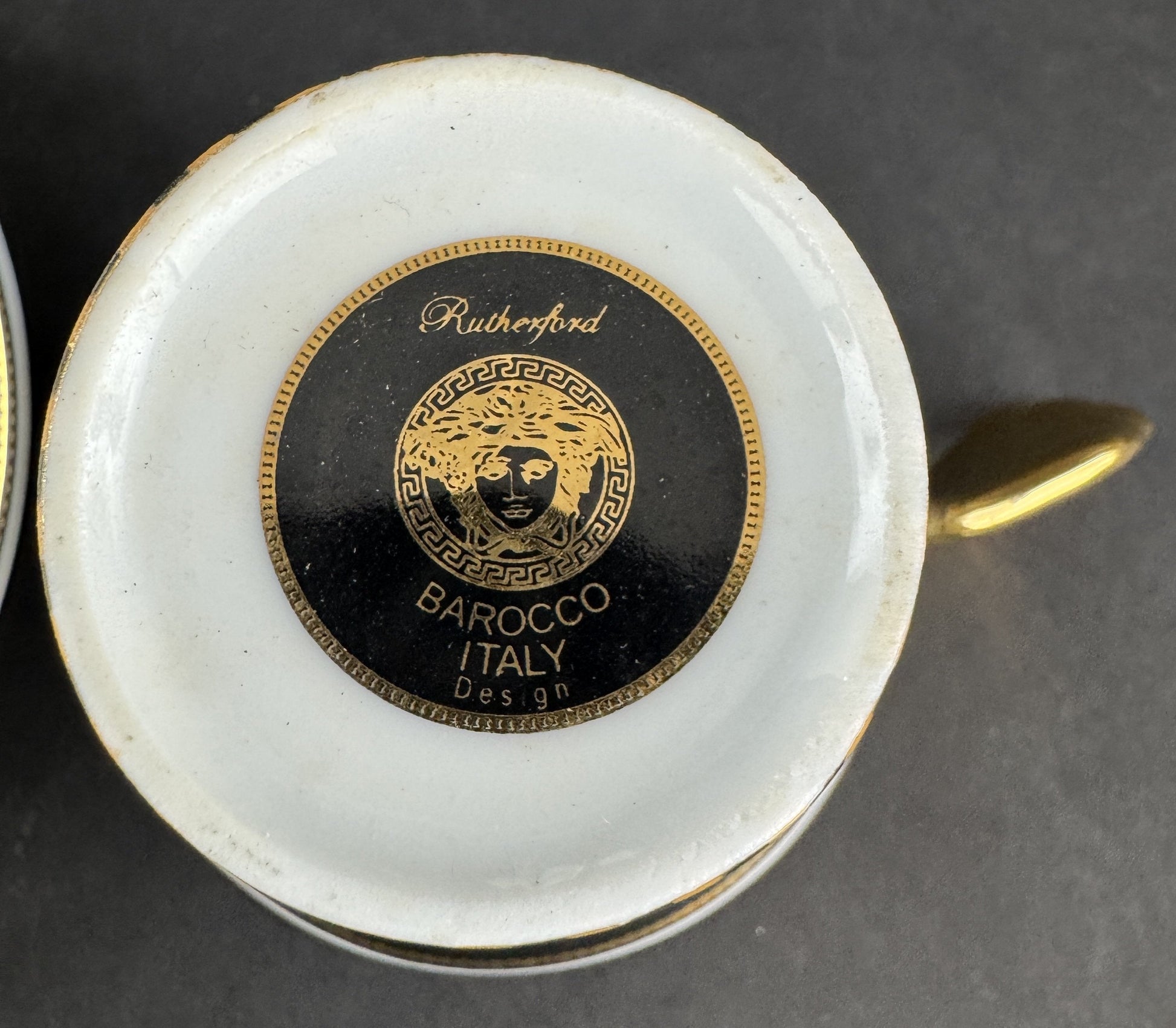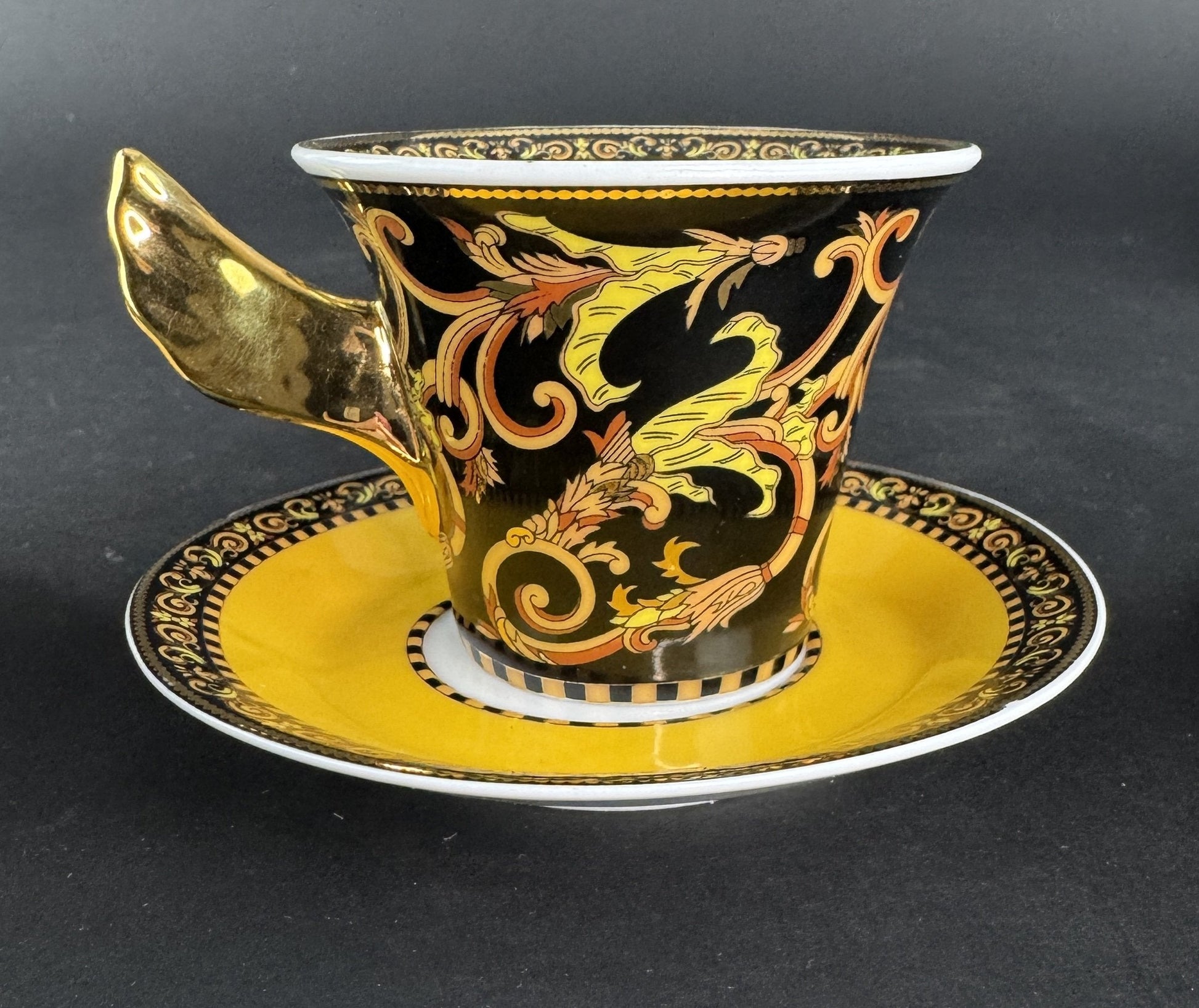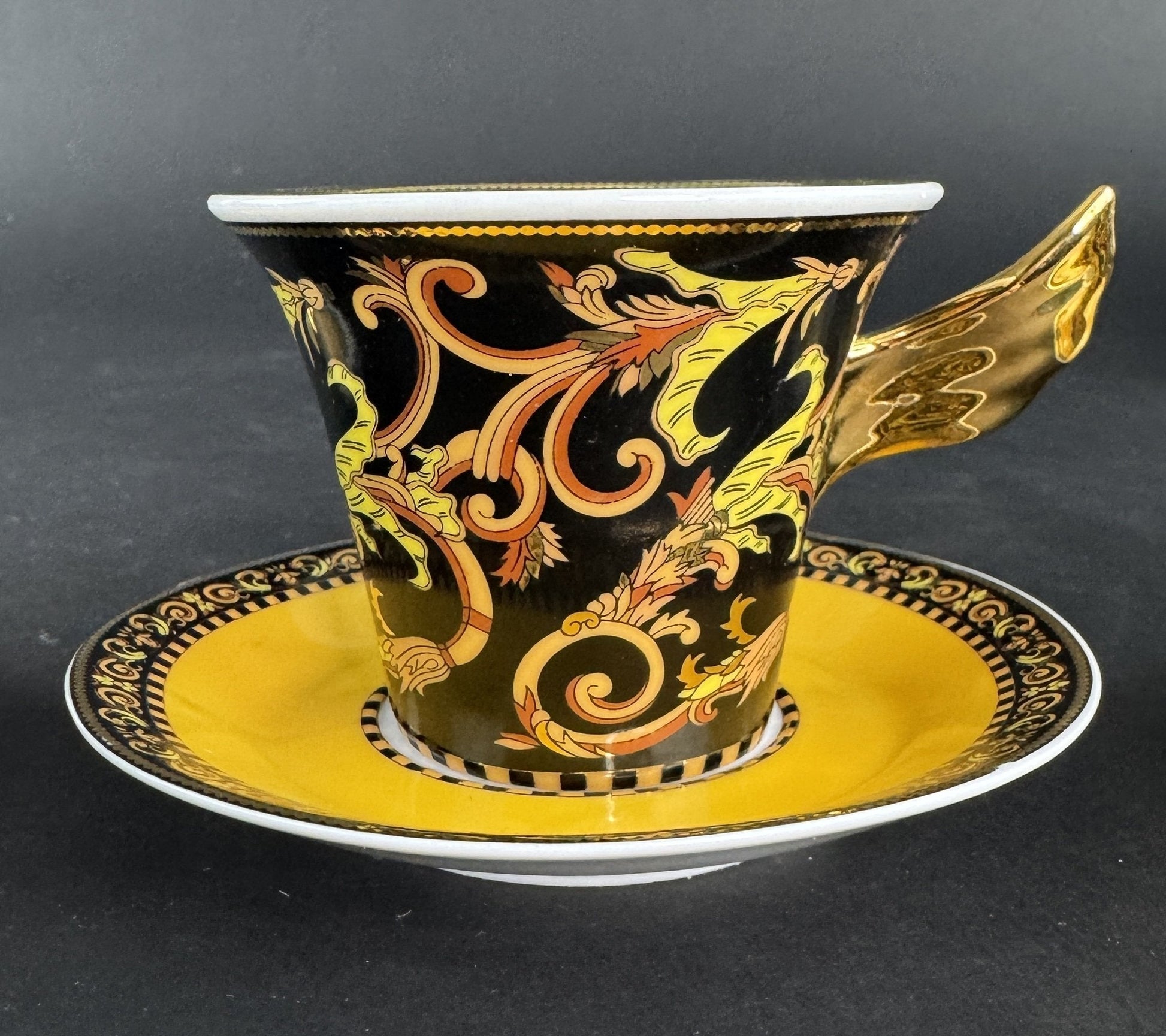 Presented is a fantastic quality set of Rutherford porcelain tea or coffee cups and saucers in the Versace Barocco collection. This is a gorgeous ornate pattern in black with rich two tone yellow scrollwork decoration and lavish gold gilt detailing, very classical and elegant. The cups features a wing-like design for the handles which is very distinctive. This pattern was also made by German maker Rosenthal. The underside of each piece has a Medusa mask design in gold against black. Please note, we have additional pieces in this pattern, which you can find by searching “Barocco” in our store.