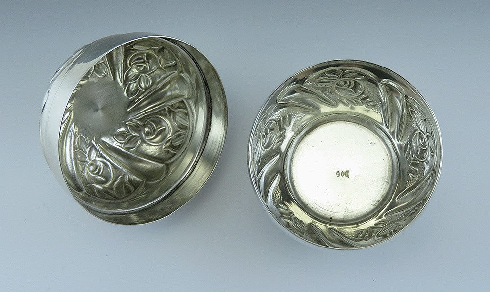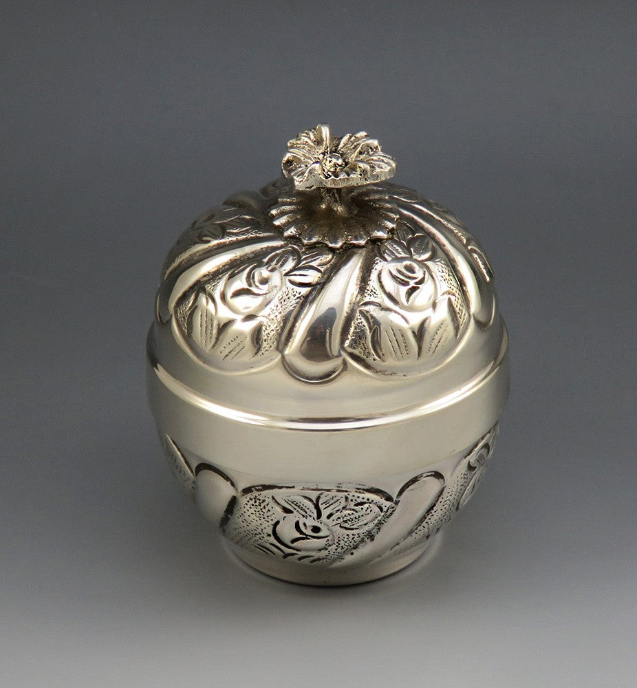 Presented is a three-inch high, 90 percent pure silver covered kumkum or trinket box with rose flower decorations in relief around both the top and bottom of the box and a flower blossom finial. This box is in new condition and will make a very nice gift for yourself or someone special to you.