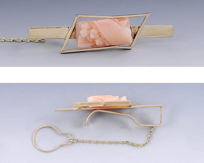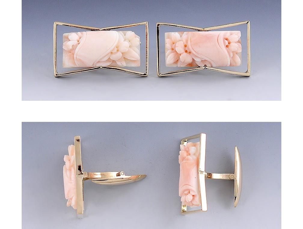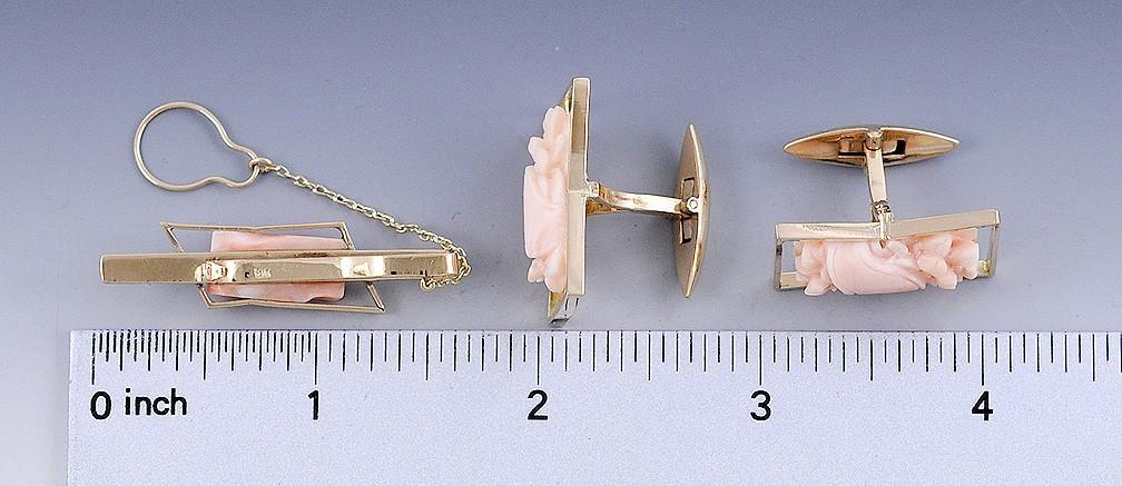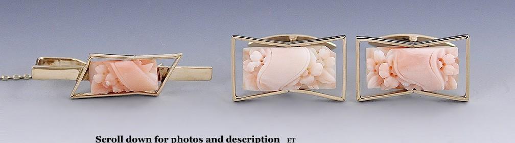 Lovely Chinese Carved Coral 14 Karat Gold Cufflinks & Tie Clip Set