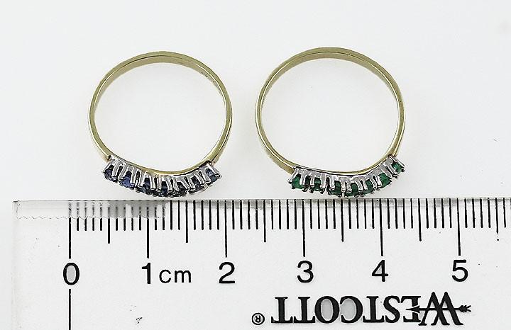 The sapphire ring is a size 6 1/2, and the emerald ring is a size 7 3/4.