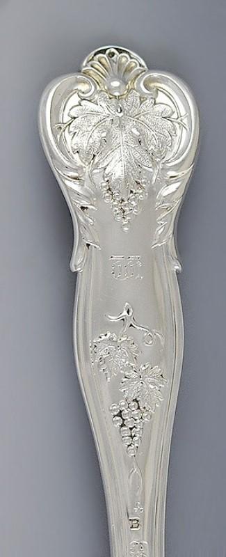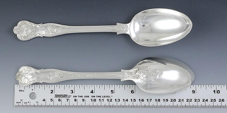 This pair of spoons is in excellent condition. The details of the pattern are quite crisp. There is some slight surface wear, commensurate with age and use, as the spoons have not been buffed to a high finish. There are no splits, no breaks, no dents, no monogram removals, and no repairs.