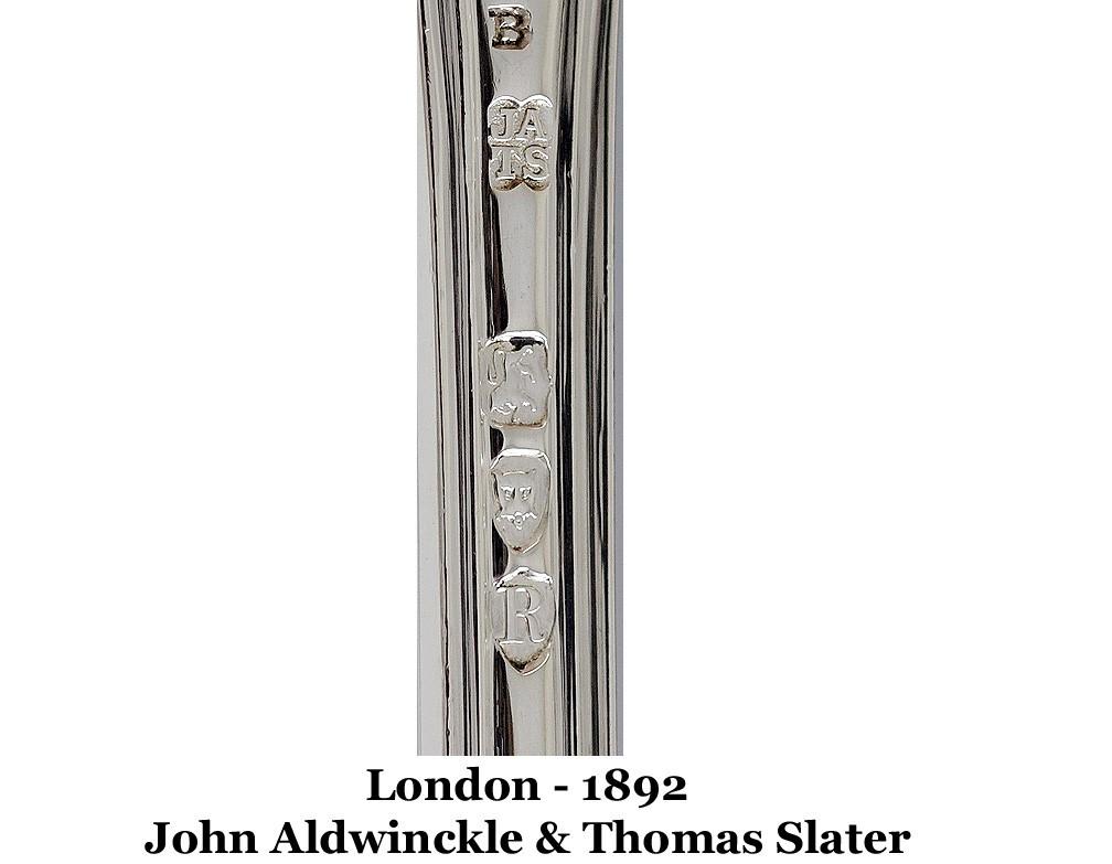 Each spoon is hallmarked on the stem with the lion passant for sterling silver, the leopard's head for the city of London, the date letter R for 1892, and the maker's mark for John Aldwinckle and Thomas Slater.