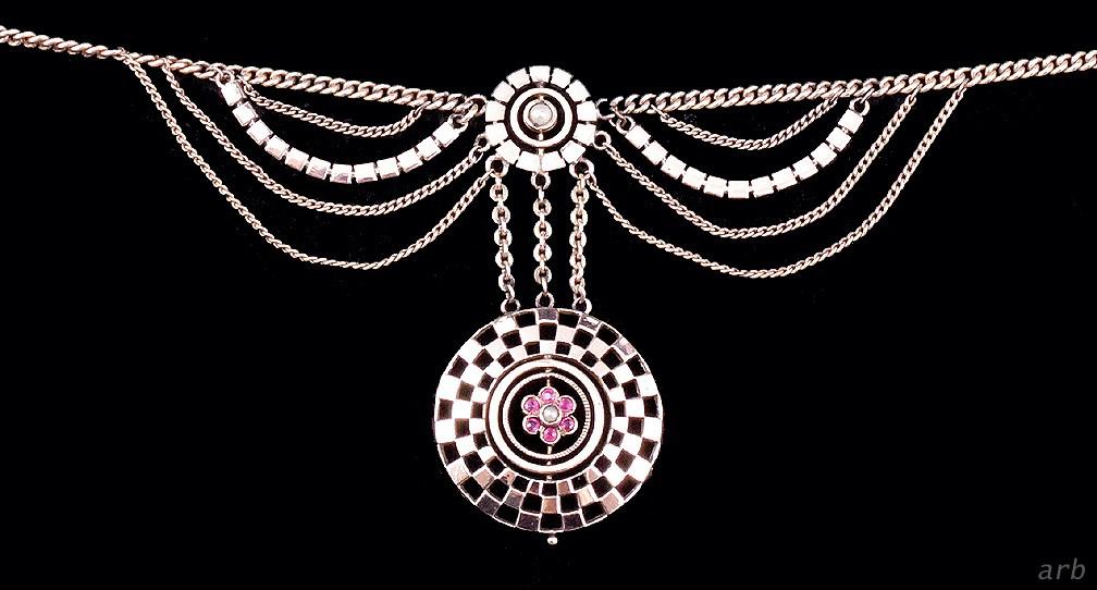 Presented is a gorgeous antique gold, ruby and seed pearl necklace, most likely made in America. The necklace dates from circa the 1890s to the 1920s. It features an ornate centerpiece with geometric shapes, a flower set with 6 real rubies, and a natural seed pearl. There are small strands of old chain embellishing the center circles.