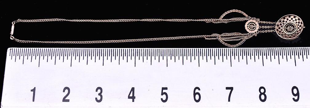 The gold of the decorative portion of the necklace (the centerpiece including the gold strands) is tested and guaranteed to be 10k rose gold. The necklace chain and clasp are not gold. There is the stamp "Union" on the last link of the chain.