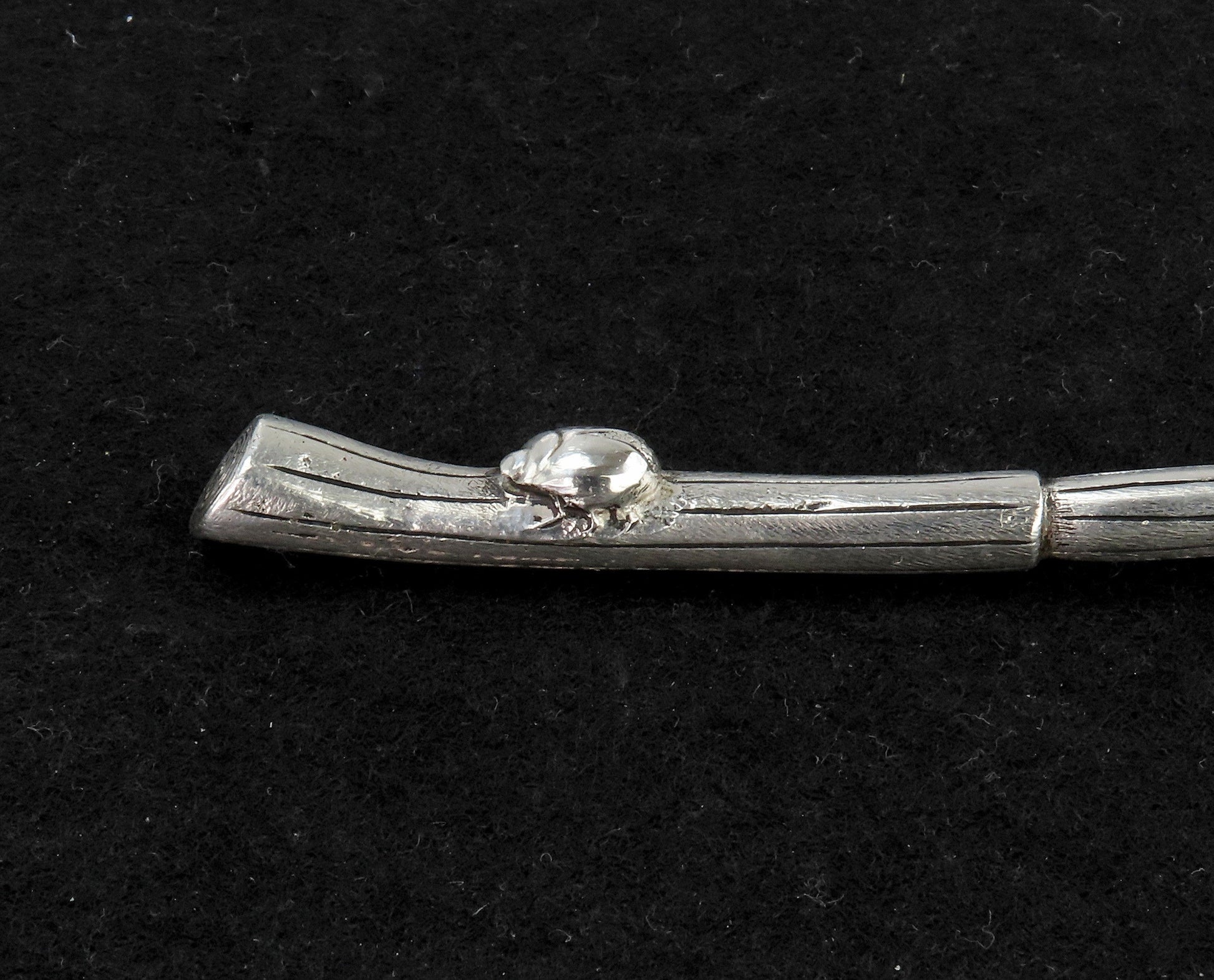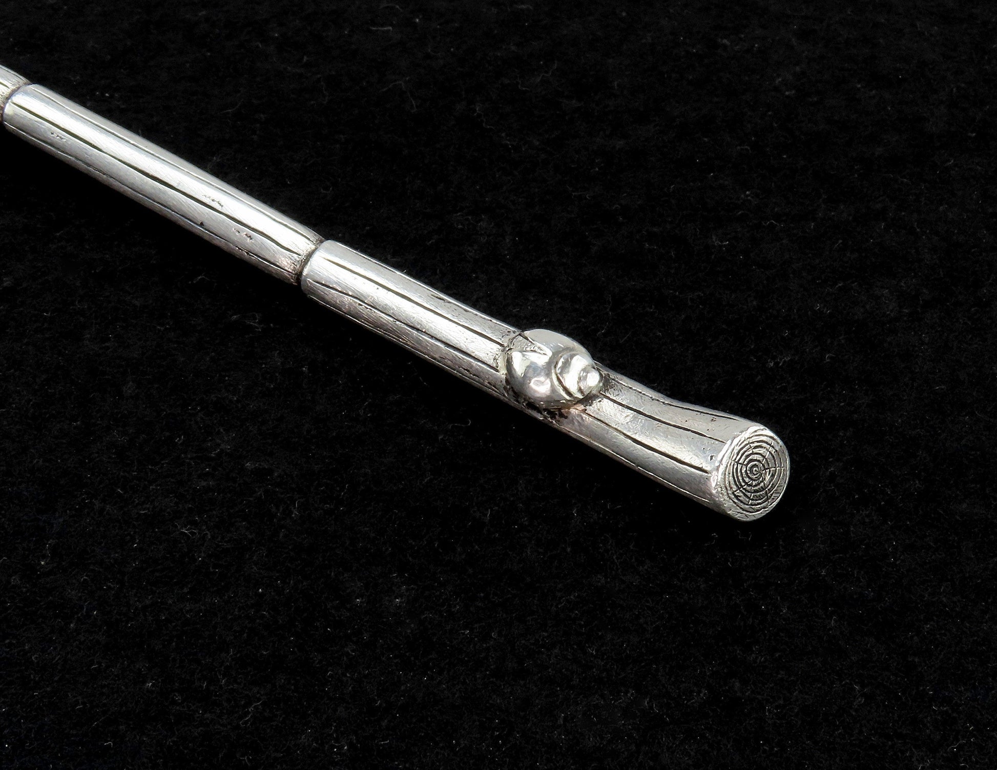 Presented is a rare antique Danish silver serving spoon, dated 1891. The handle of the spoon is beautifully designed as a realistic segmented branch, well rendered with vertical graining along the shaft and the concentric woodgrain rings visible in the end. The terminal of the handle has an applied silver ladybug or similar beetle, very charming. This type of naturalistic almost Aesthetic Movement style piece is not something you usually see in Danish silver, so this is a great collector's piece.