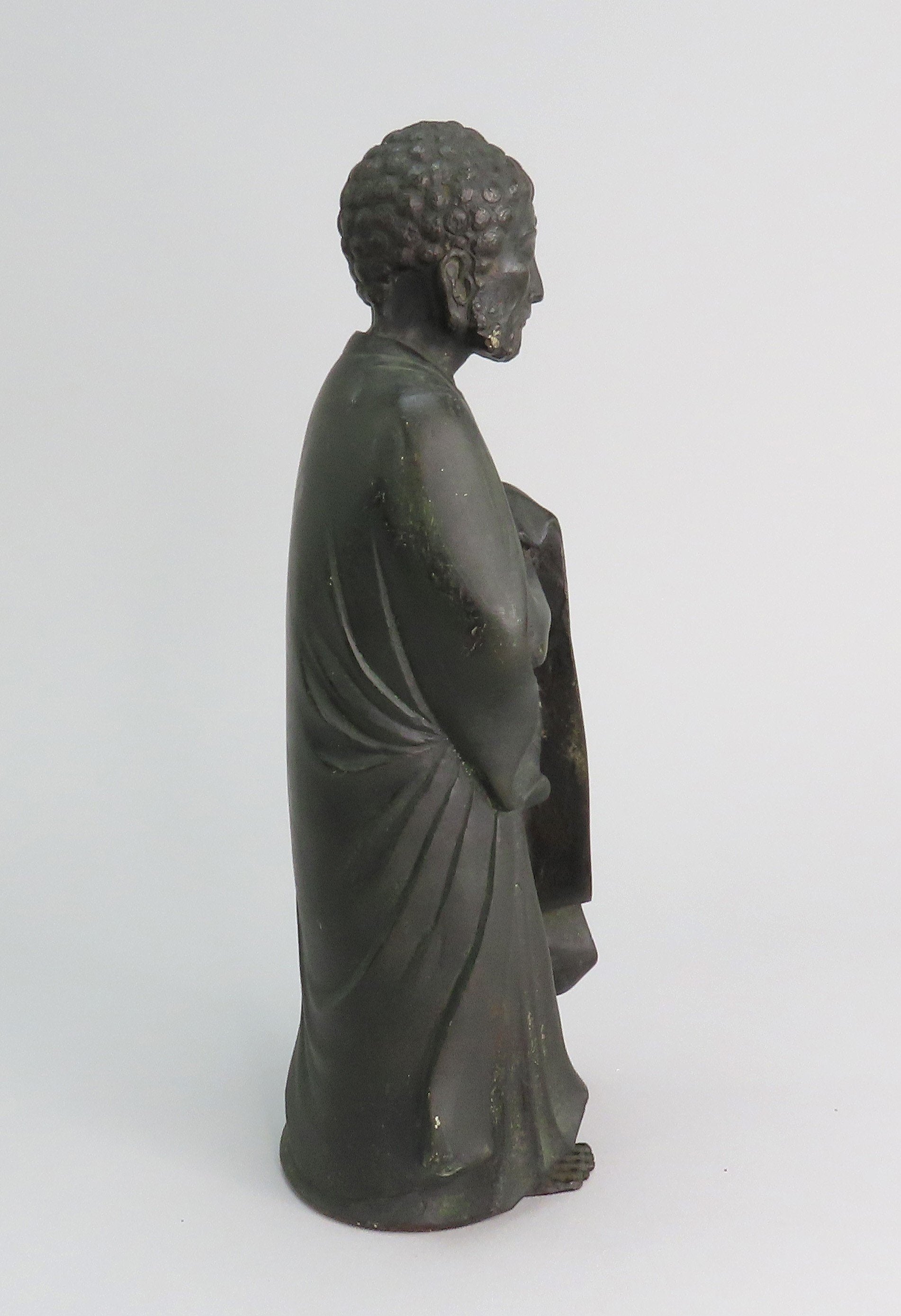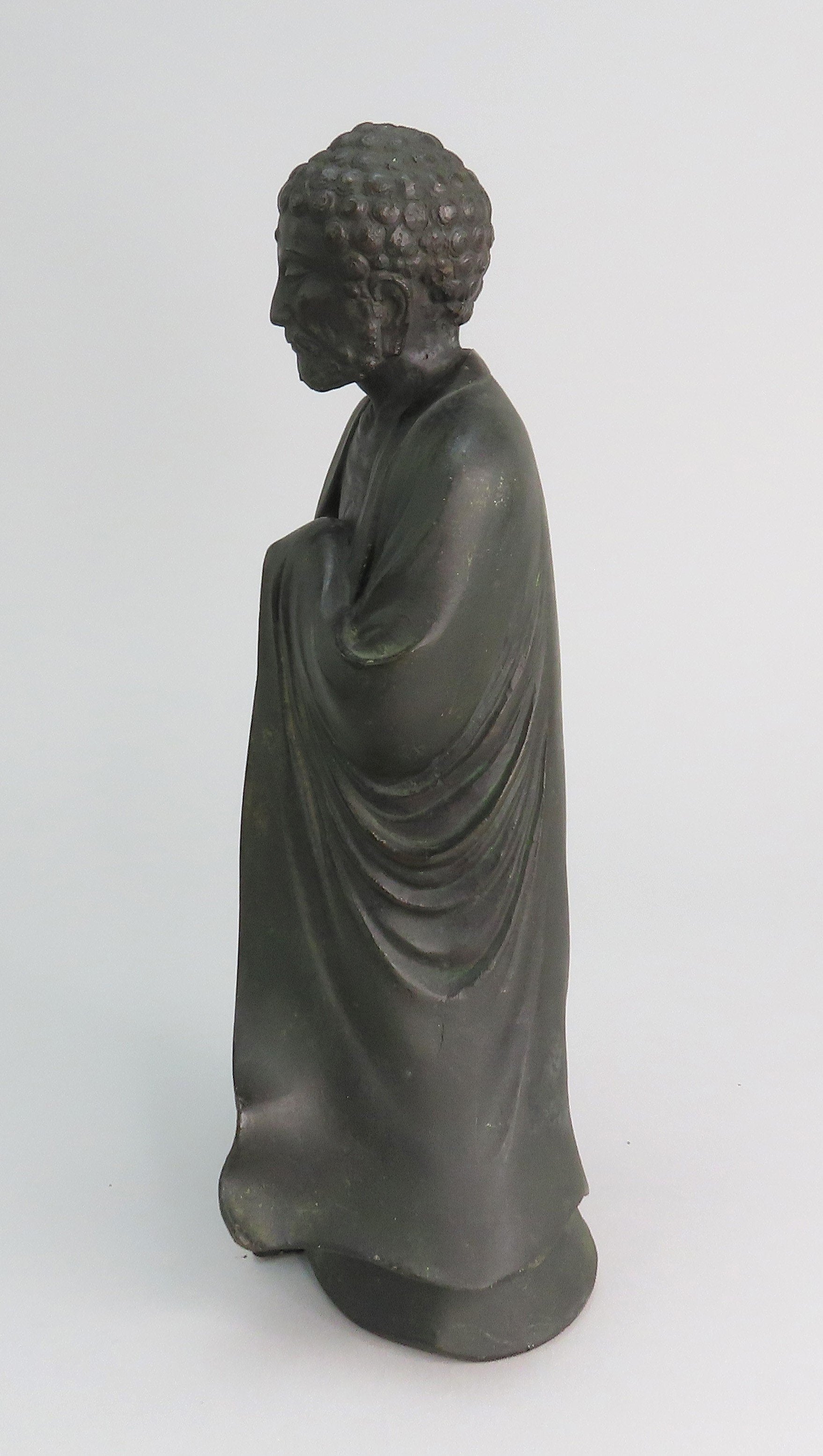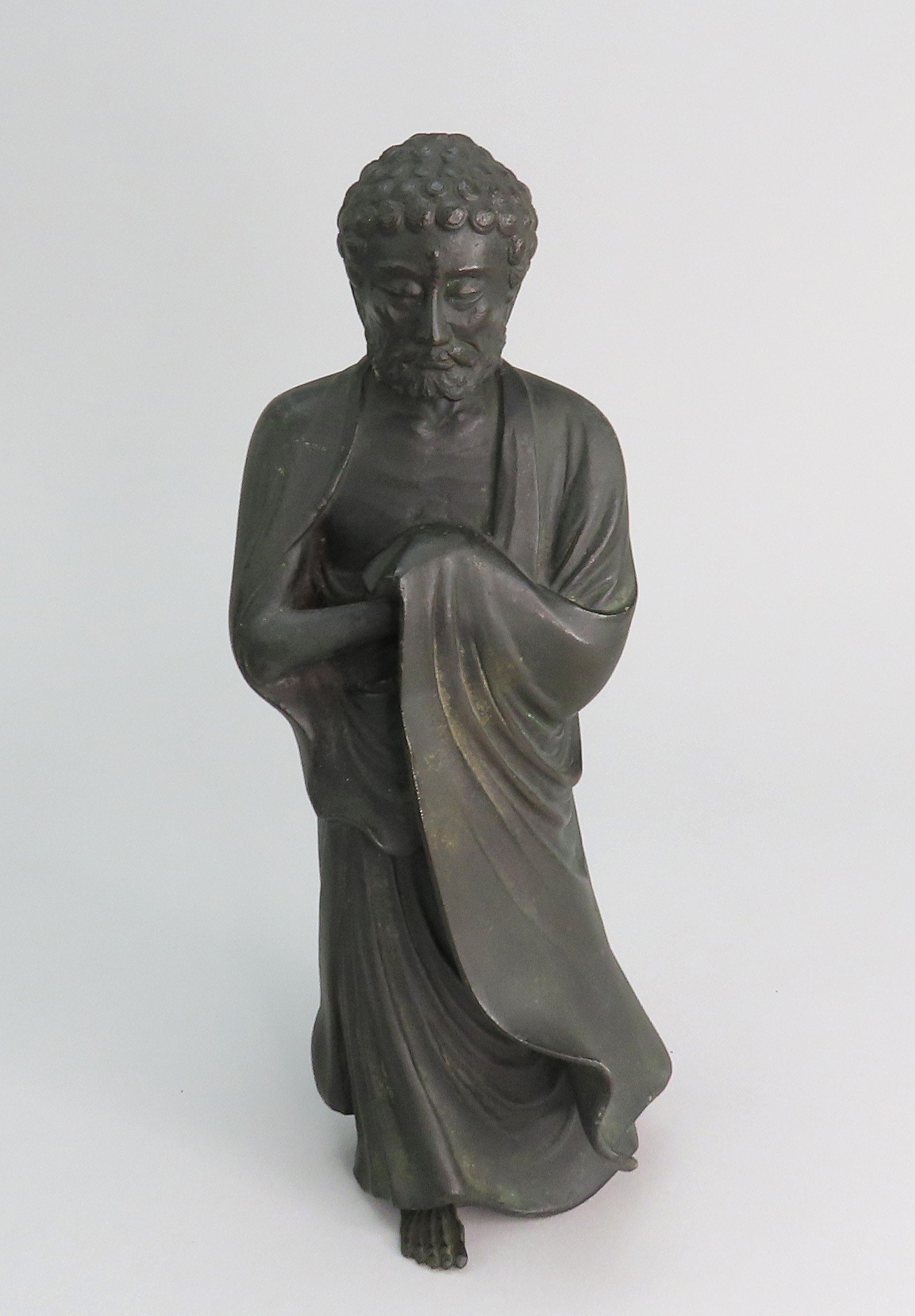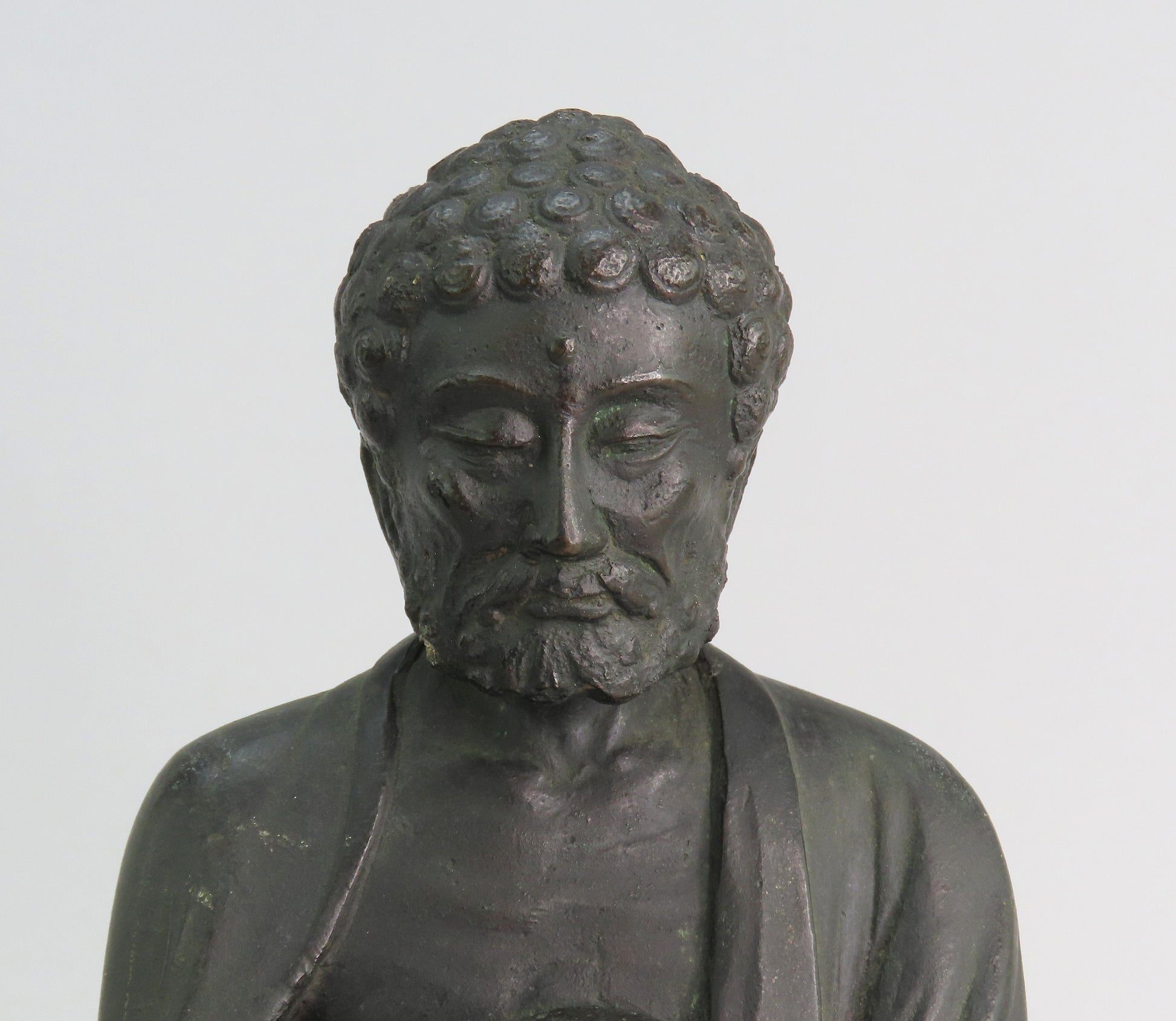 Presented is an interesting antique Asian bronze statue of a luohan or sage, dating to around the 1840s-1890s, possibly earlier. We aren't certain but believe this to be Chinese rather than Japanese. The figure is nicely detailed and well cast, showing a male figure with beard, bared feet and chest, and sweeping, flowing robes. The figure's hollow cheeks and detailed, emaciated sternum speak to a life of ascetic dedication. The bronze has a dark, sombre patina and overall the statue has a very fine look.