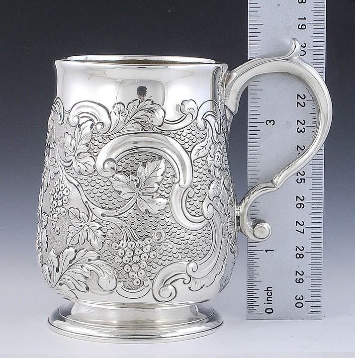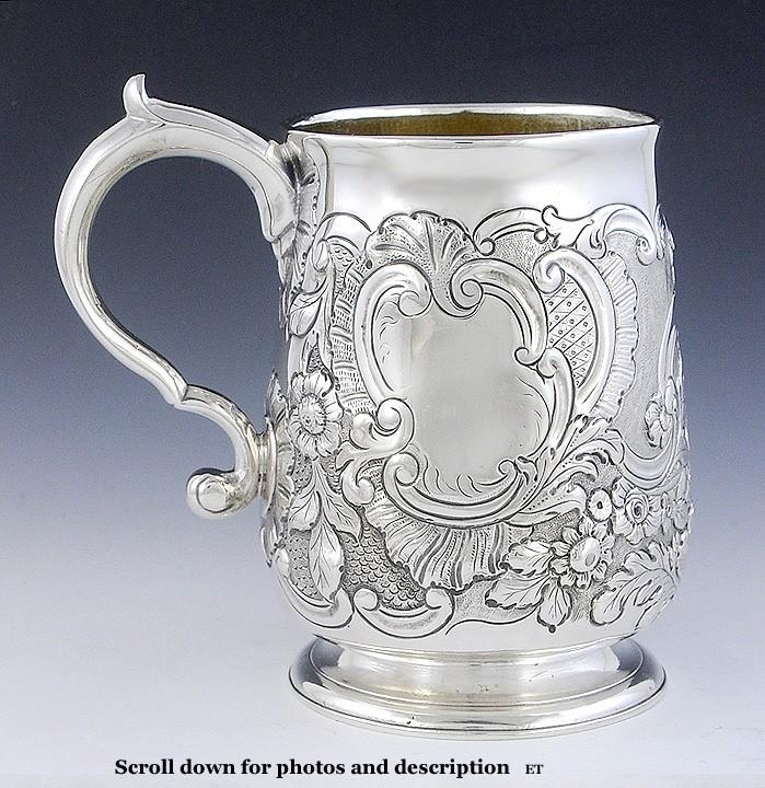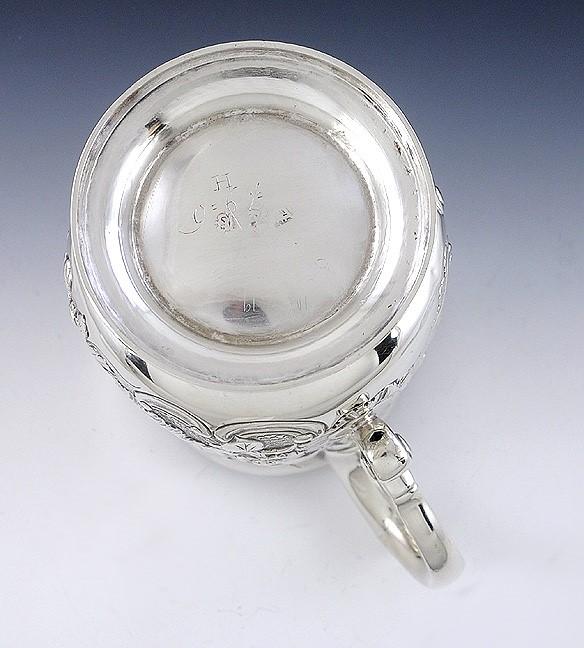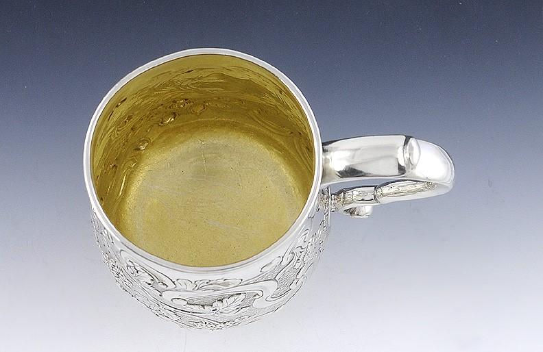 This piece is in great condition. There has probably been a monogram removal to the cartouche on the side, but the silver is still very thick and the mug could still be re-engraved. There are no splits, no breaks, no monograms, and no repairs.