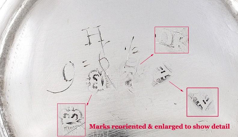 This piece is hallmarked on the underside with the crowned harp mark for Dublin, the date letter Y for 1715, and the maker's mark for David King.