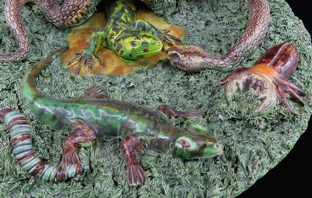 Rare Antique Signed Jose A Cunha Palissy Majolica Plate Snake Lizard Beetle