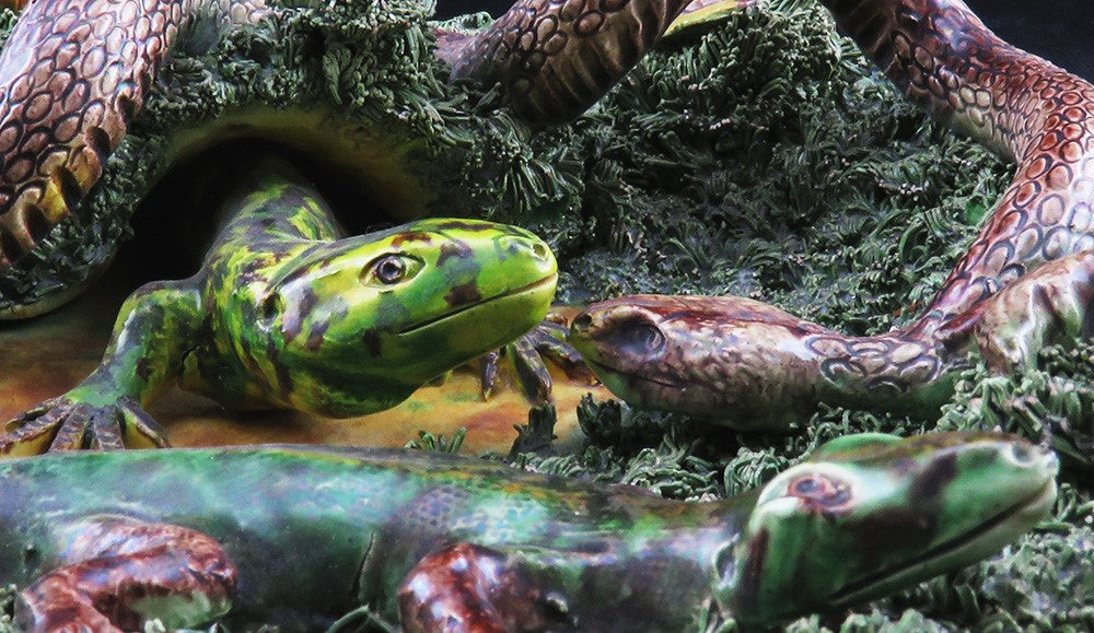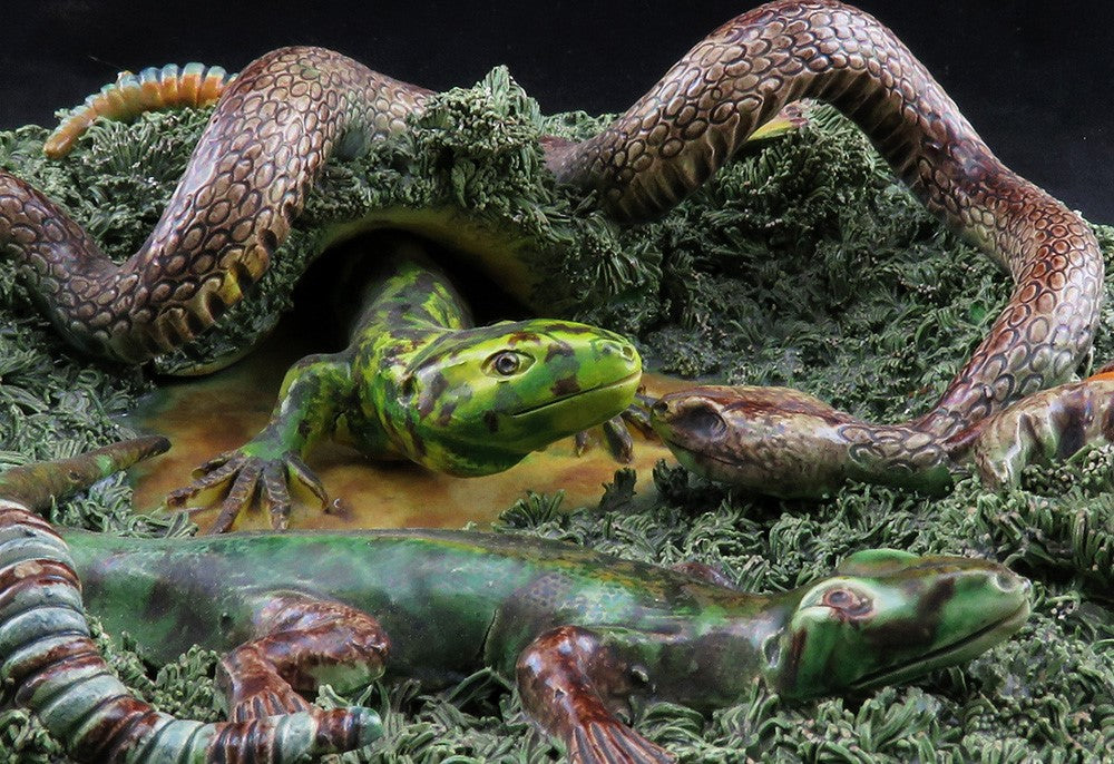Presented is a superb quality signed Portuguese Majolica Palissy plate with a lush rainforest scene. The plate is very intricately done with full figural animals and insects on the surface surrounded by foliage, like a panoramic sculpture. The central figures are a colorful lizard facing off with a snake from inside its burrow, with various butterflies, beetles, and caterpillars surrounding. The colors are very rich and eye catching, and the plants, animals, and insects are very detailed and finely formed. Please view our photos carefully to see all the details! The back of the plate has a wire for hanging.