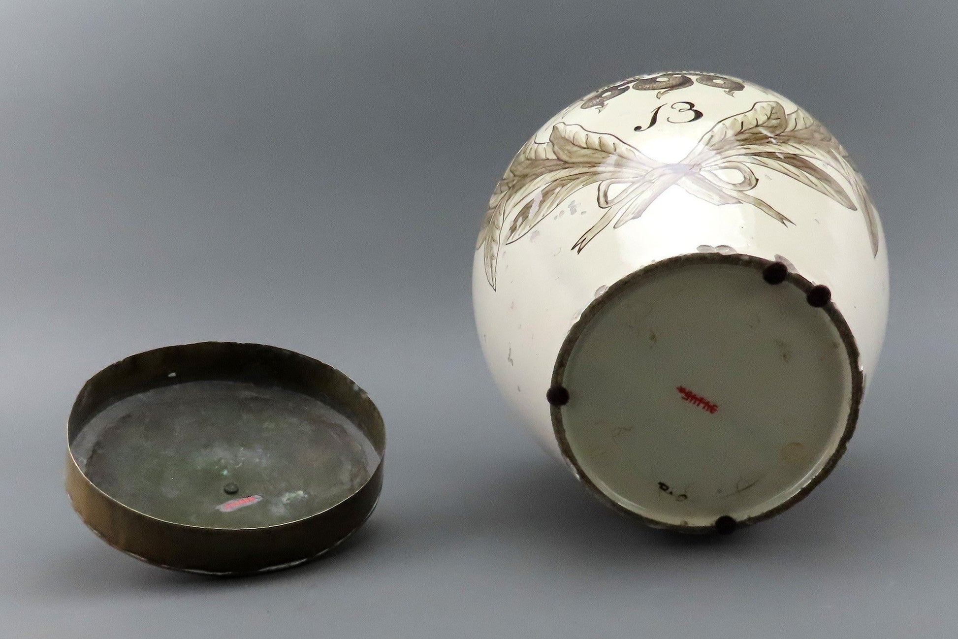 Presented is a fantastic antique German tin glazed earthenware tobacco jar, from circa 1800. The jar is an impressive size, and nicely decorated on the exterior with a dragon design, as well as 'Drakenburg #13' perhaps for the strain it was used to contain. The jar has its original brass lid, which has a red accession number on the underside for the Museum of Fine Arts. We also have a tag with the provenance of the piece, which reads: “Tin glazed earthenware tobacco jar w brass cover. Germany – C1800 – foliate framed crest of dragons titled Drakenburg #13. Provenance: Property of Museum of Fine Arts, Boston. $875 SA 5049”