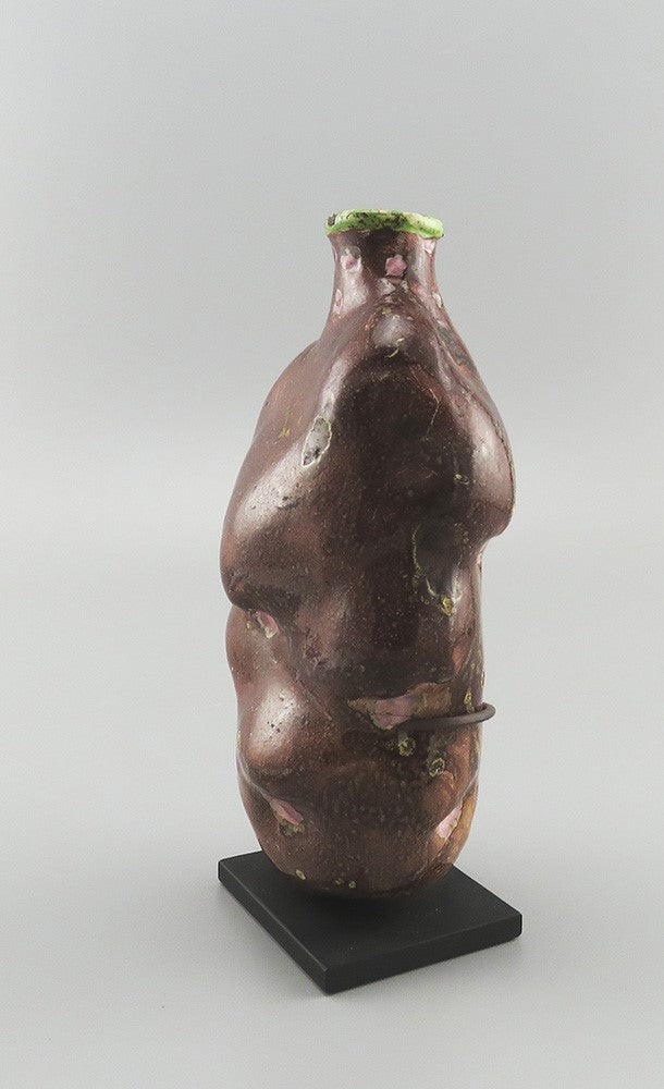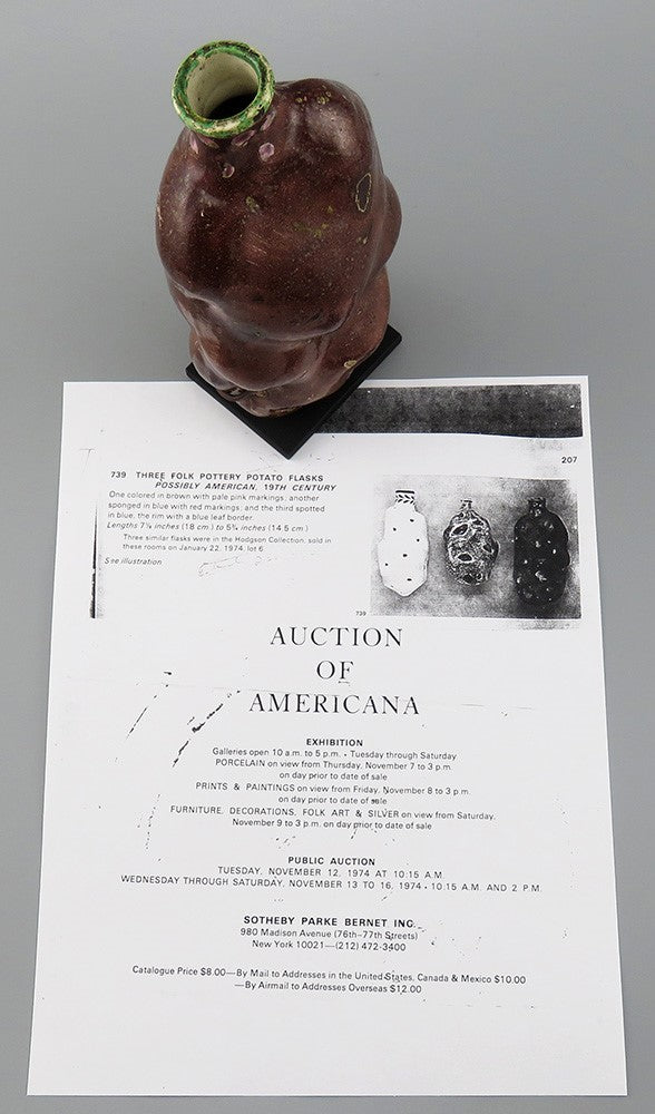 Presented is a rare American folk art pottery piece, a potato flask. This flask dates to around the 1820s-1860s. This particular flask is a naturalistic reddish brown with pink and darker brown detailing, in the form of the potato's eyes, as well as a striking green rim around the mouth. The flask has an enameled metal stand, so it can be displayed upright, and it actually makes a really appealing display piece this way. This flask is one of a group of three sold at Sotheby's auction house on November 12, 1974.
