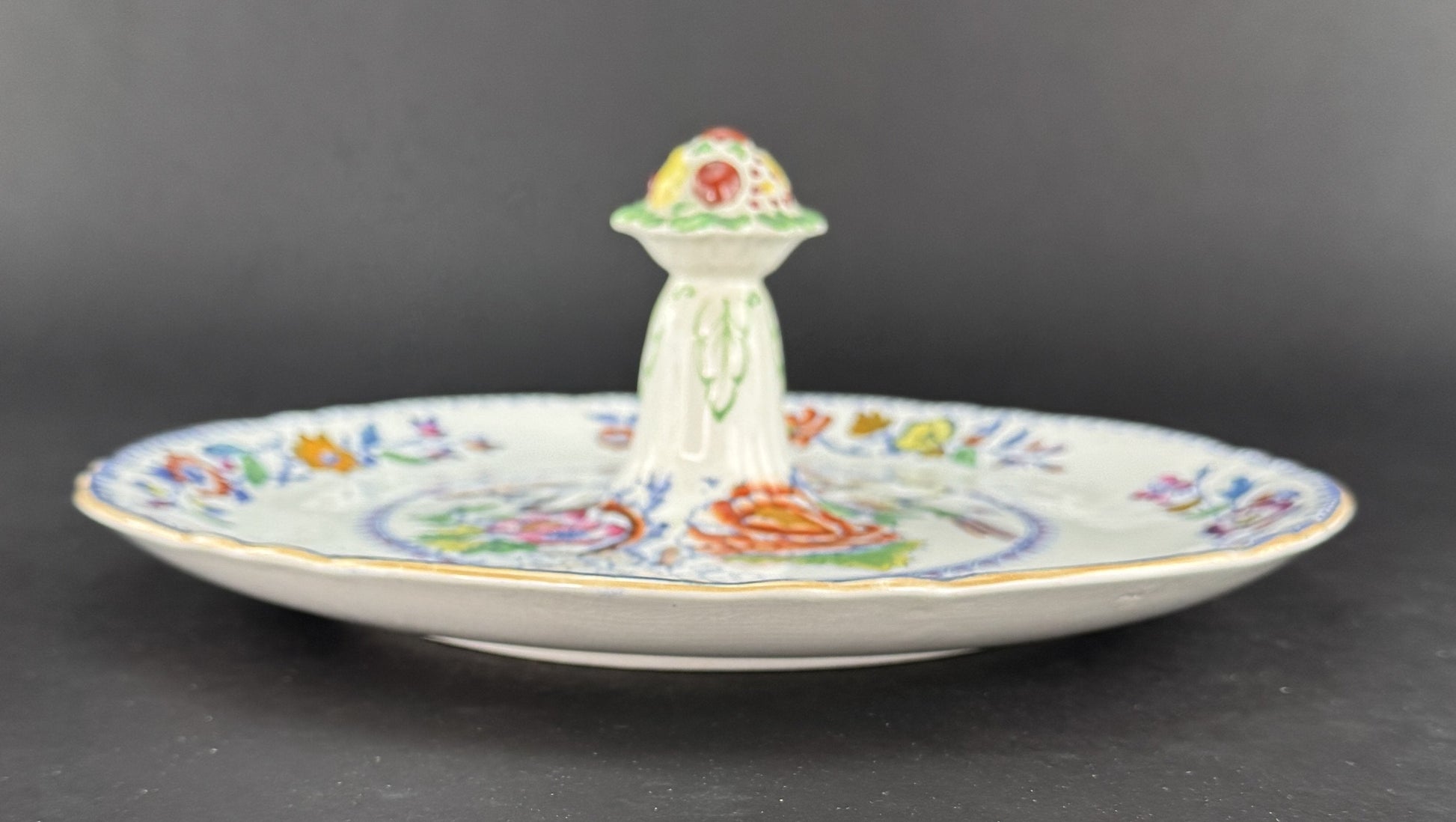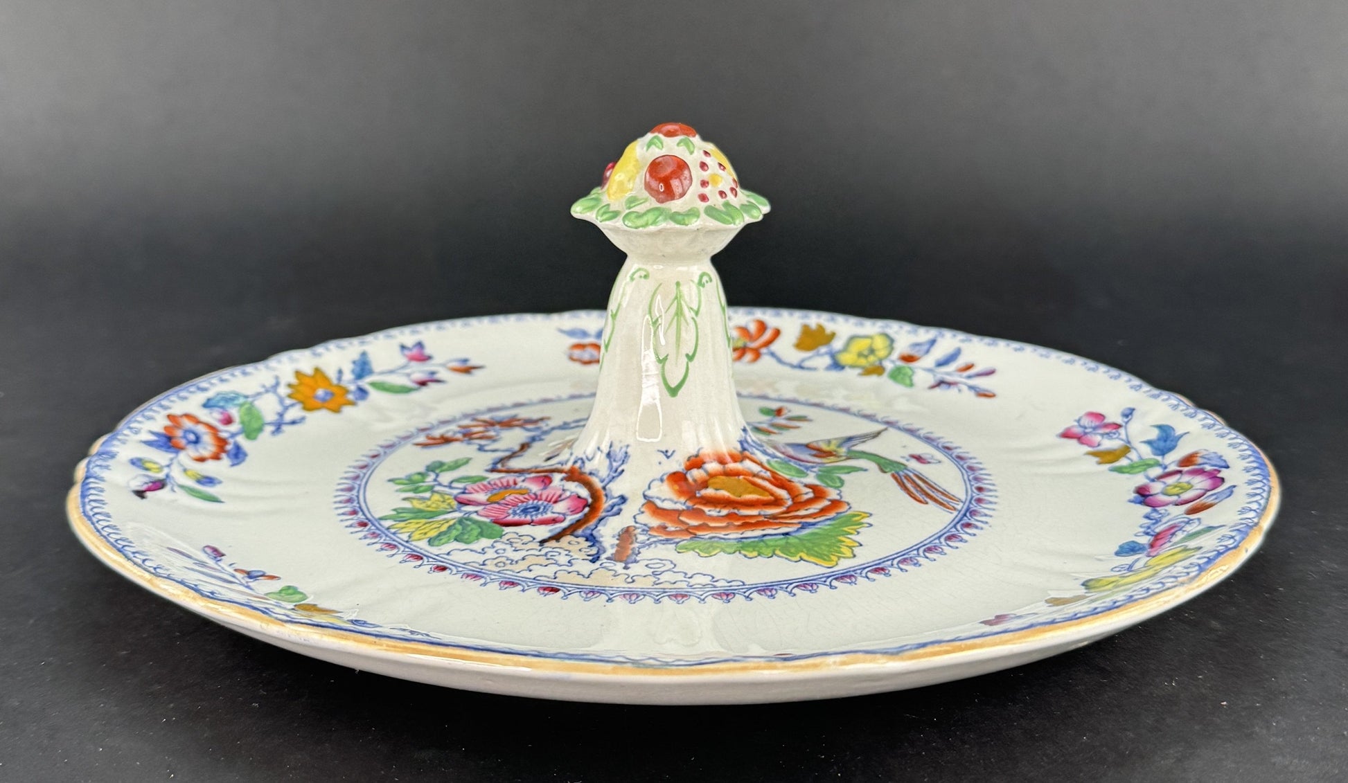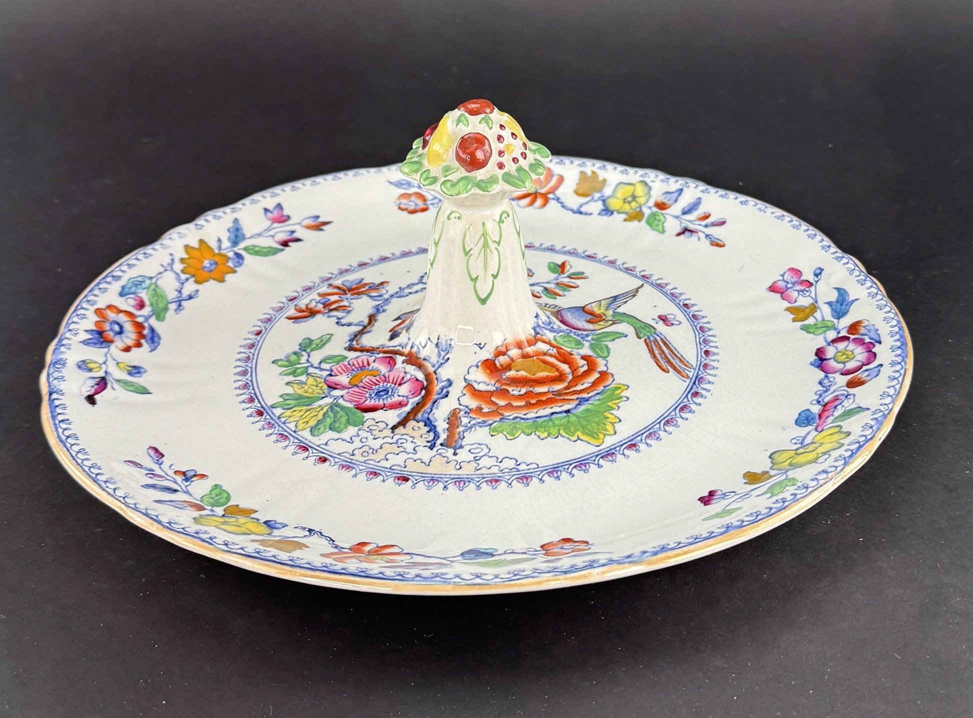 Presented is a rare antique Mason's ironstone china serving plate, dating to around the 1900s-1930s. This piece is made in the highly sought after Flying Bird pattern, which is a vibrant and colorful Chinoiserie pattern depicting a long tailed bird in flight surrounded by stunning flowers and foliage. The palette is a very eye-catching array of blues, greens, orange, purple and pink shades, with fine gold gilt detailing. This pattern was first produced by Davenport circa 1815, but would go on to be made by Mason's as well as other fine English makers. We have many additional pieces in this pattern from the same estate including some particularly rare examples, which you can find by searching “Flying Bird” in our store. This particular piece is very distinctive, featuring a central pillar or spindle topped with a bowl of fruit design. Could be a little display for colorful fruit, pastries, or whatever else you like.