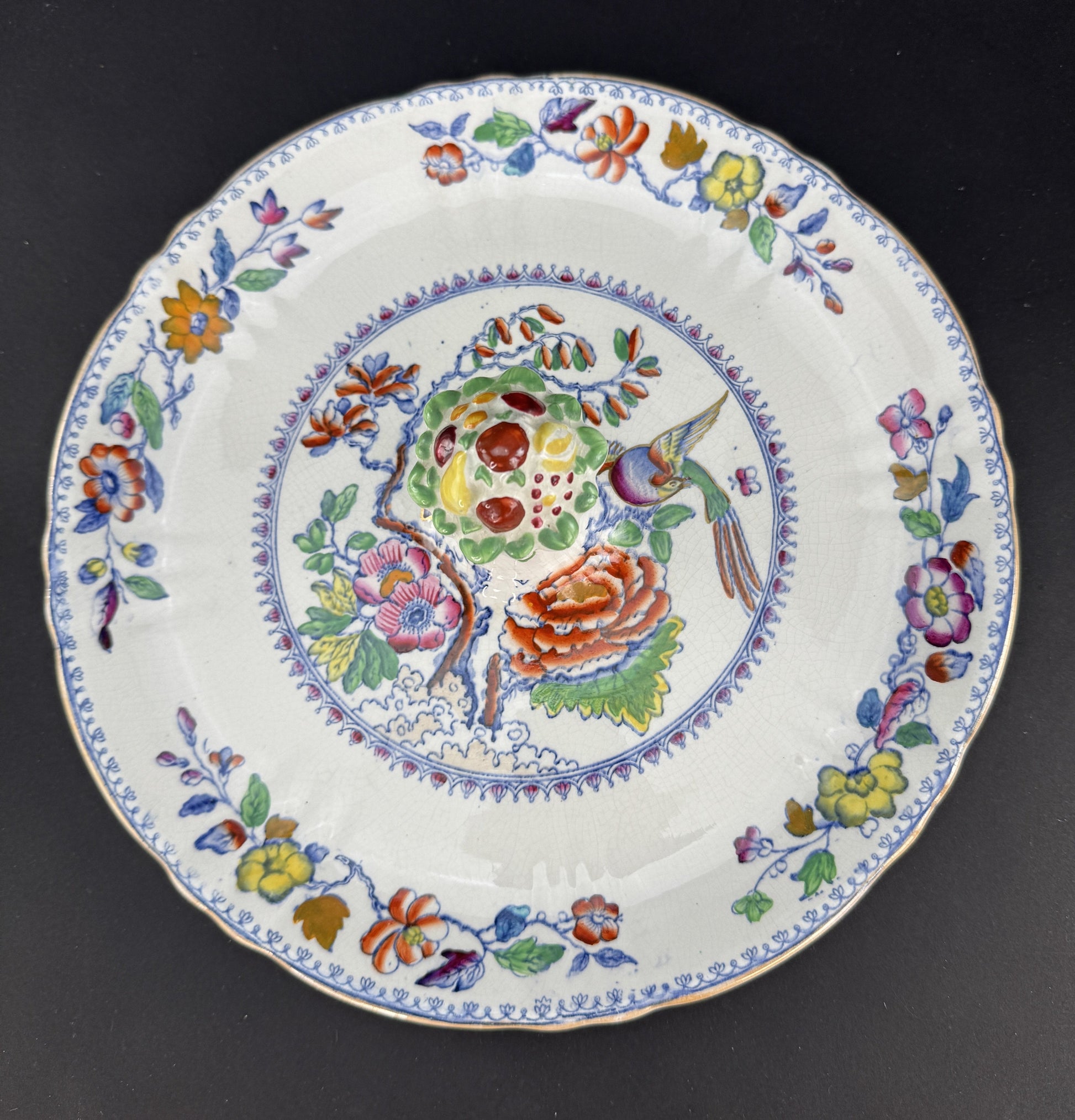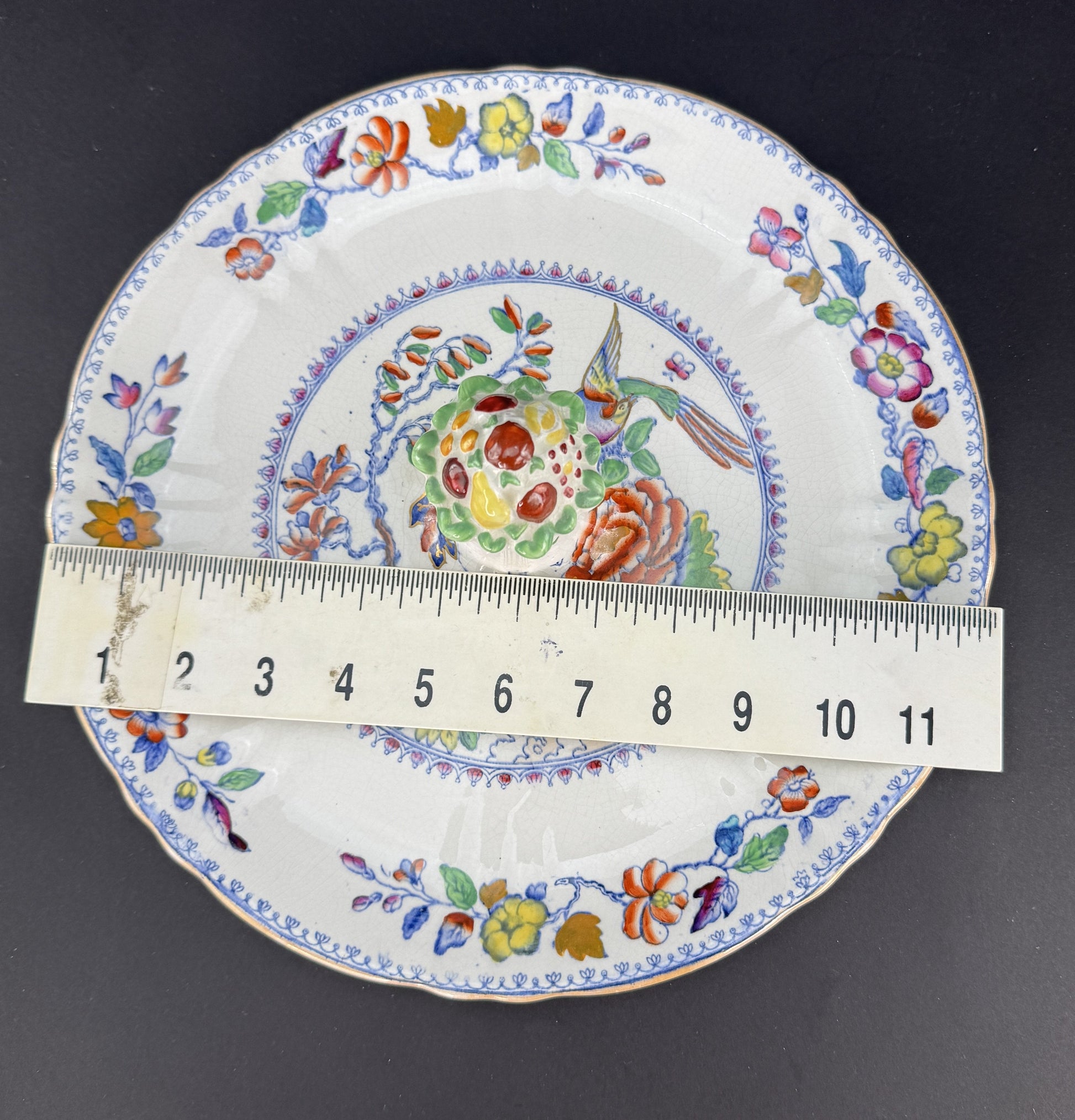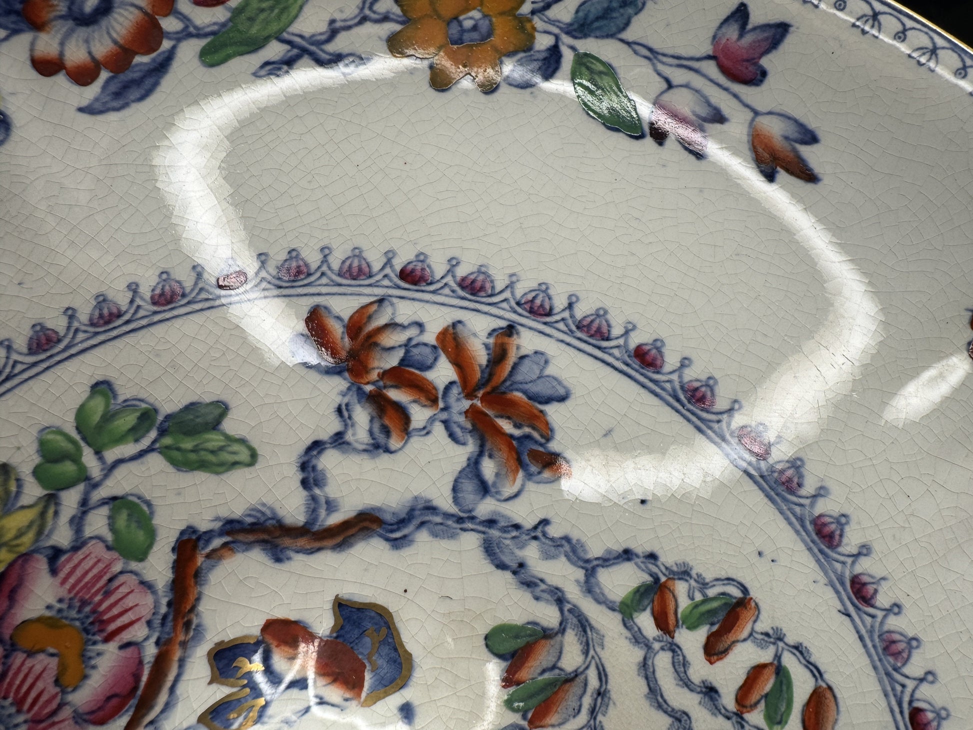 Presented is a rare antique Mason's ironstone china serving plate, dating to around the 1900s-1930s. This piece is made in the highly sought after Flying Bird pattern, which is a vibrant and colorful Chinoiserie pattern depicting a long tailed bird in flight surrounded by stunning flowers and foliage. The palette is a very eye-catching array of blues, greens, orange, purple and pink shades, with fine gold gilt detailing. This pattern was first produced by Davenport circa 1815, but would go on to be made by Mason's as well as other fine English makers. We have many additional pieces in this pattern from the same estate including some particularly rare examples, which you can find by searching “Flying Bird” in our store. This particular piece is very distinctive, featuring a central pillar or spindle topped with a bowl of fruit design. Could be a little display for colorful fruit, pastries, or whatever else you like.