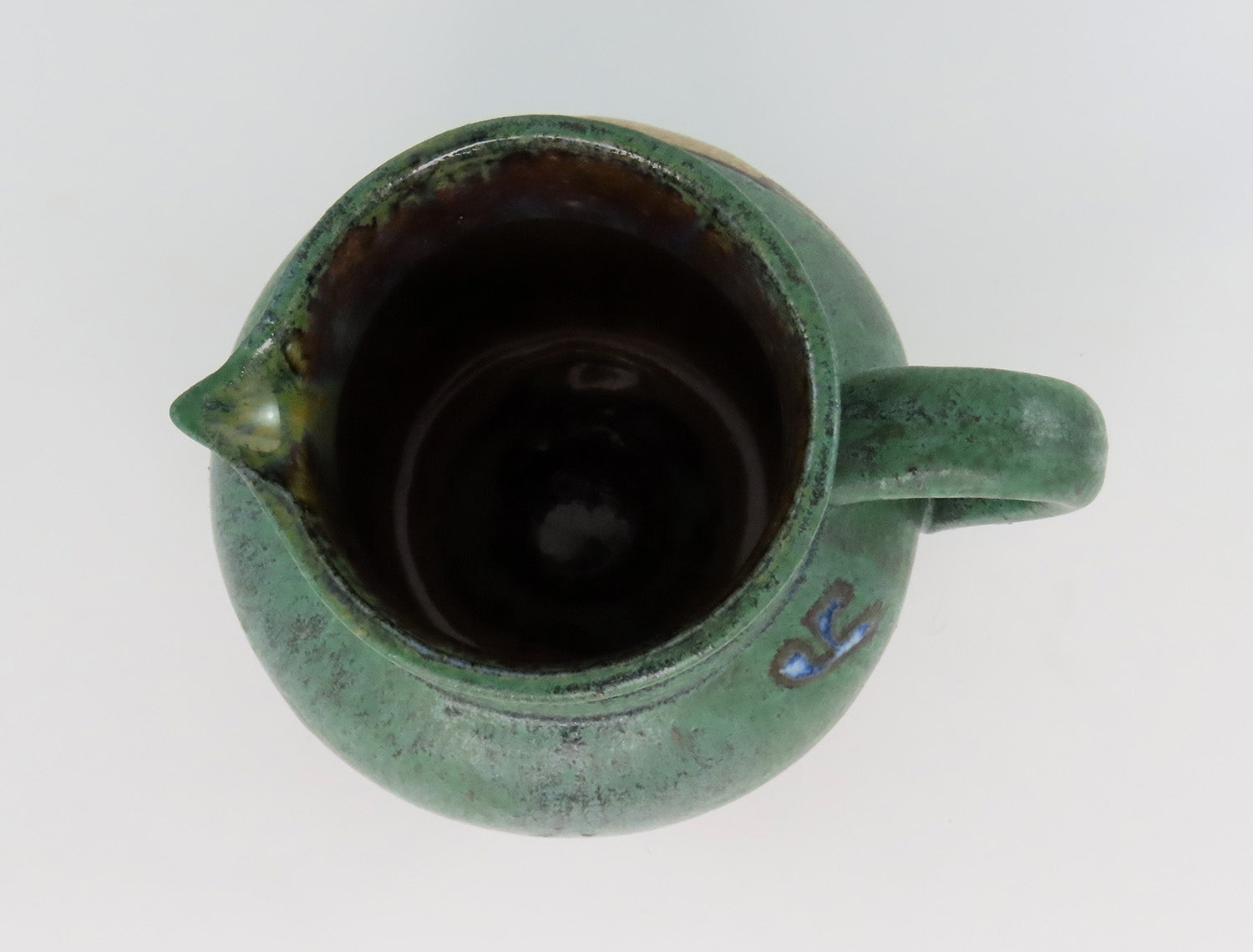 Presented is a lovely antique Teplitz pitcher by Eduard Stellmacher, dating to the early 1900s. The pitcher is done in a beautiful green glaze, with brown and blue around the bottom. Around the side is a nicely detailed hand painted lion, with a stylized eye motif off center on the opposite side. This piece came to use with a little handwritten note that includes detailed about the decorator, Eduard Stellmacher, whose father was Alfred Stellmacher (founder of Turn porcelain factory Reissner, Stellmacher & Kessel) but who left Amphora to start his own firm in 1904.