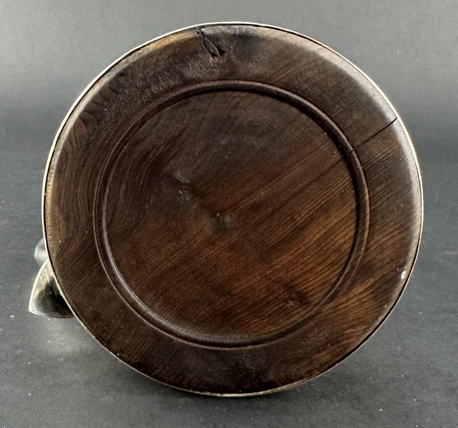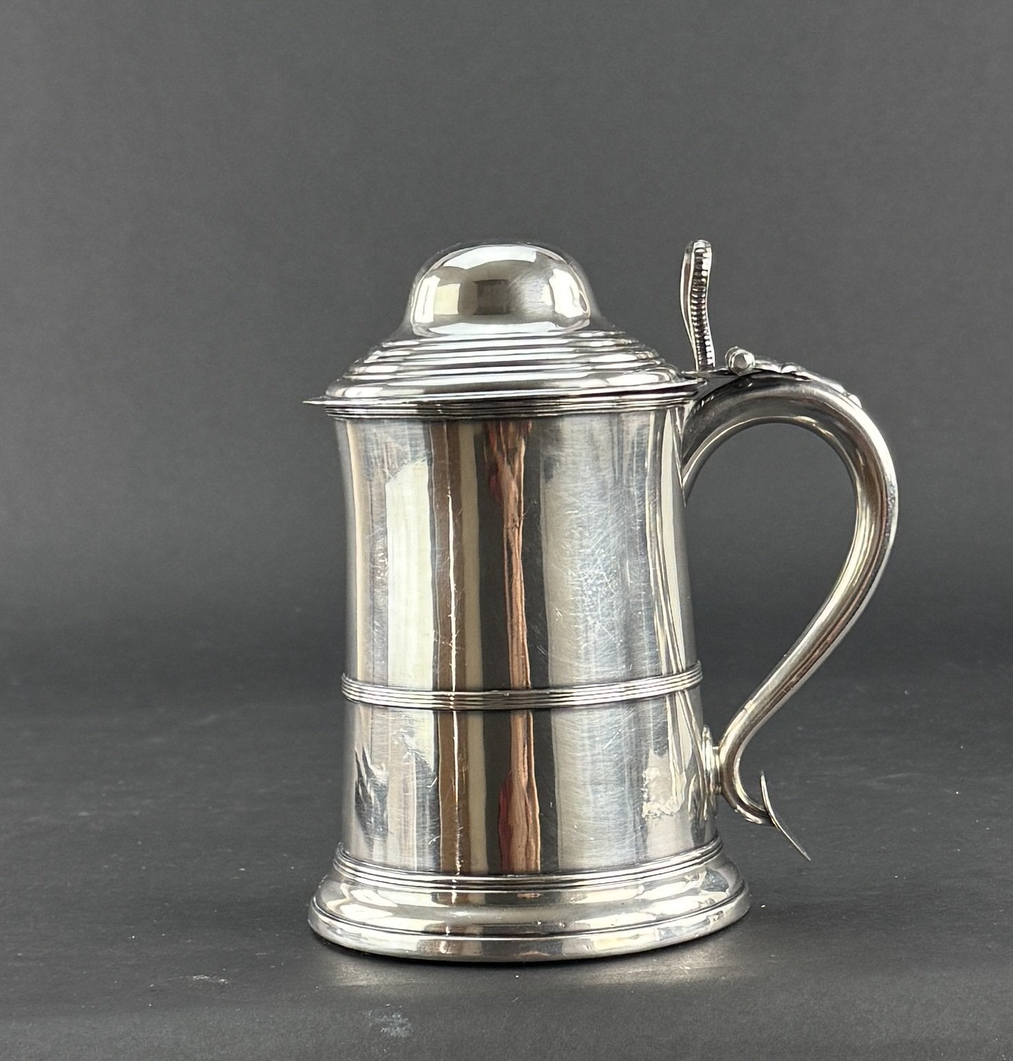 This piece was retailed from S. J. Shrubsole in London in 1978 (per a receipt that came to us with the tankard) for £225, which converted and accounting for inflation is a much larger sum today, in the vicinity of $2100. The side of the tankard is stamped with a maker's mark of T.B. and a mark reading “silvered edge” (repeated twice). This indicates the piece is made with the old style of Sheffield construction where thick sterling silver is used to wrap around the edges and sometimes décor elements of a piece.