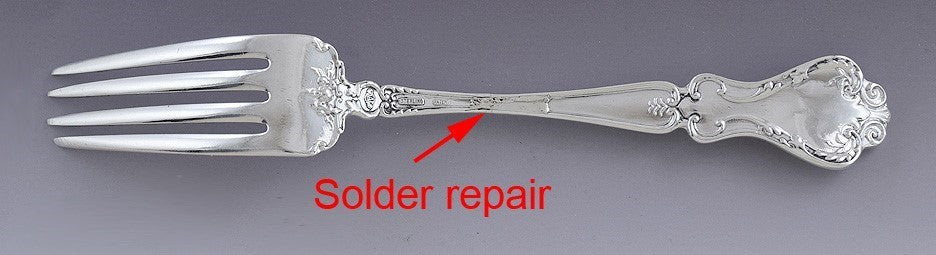 This set is in great condition. There are only the most minor of knife marks to the backs of the tines, and minimal rounding to the tips. The details of the pattern are nice and crisp. There are no splits, no breaks, no dents, no cracks, no monograms, no monogram removals, and no repairs.