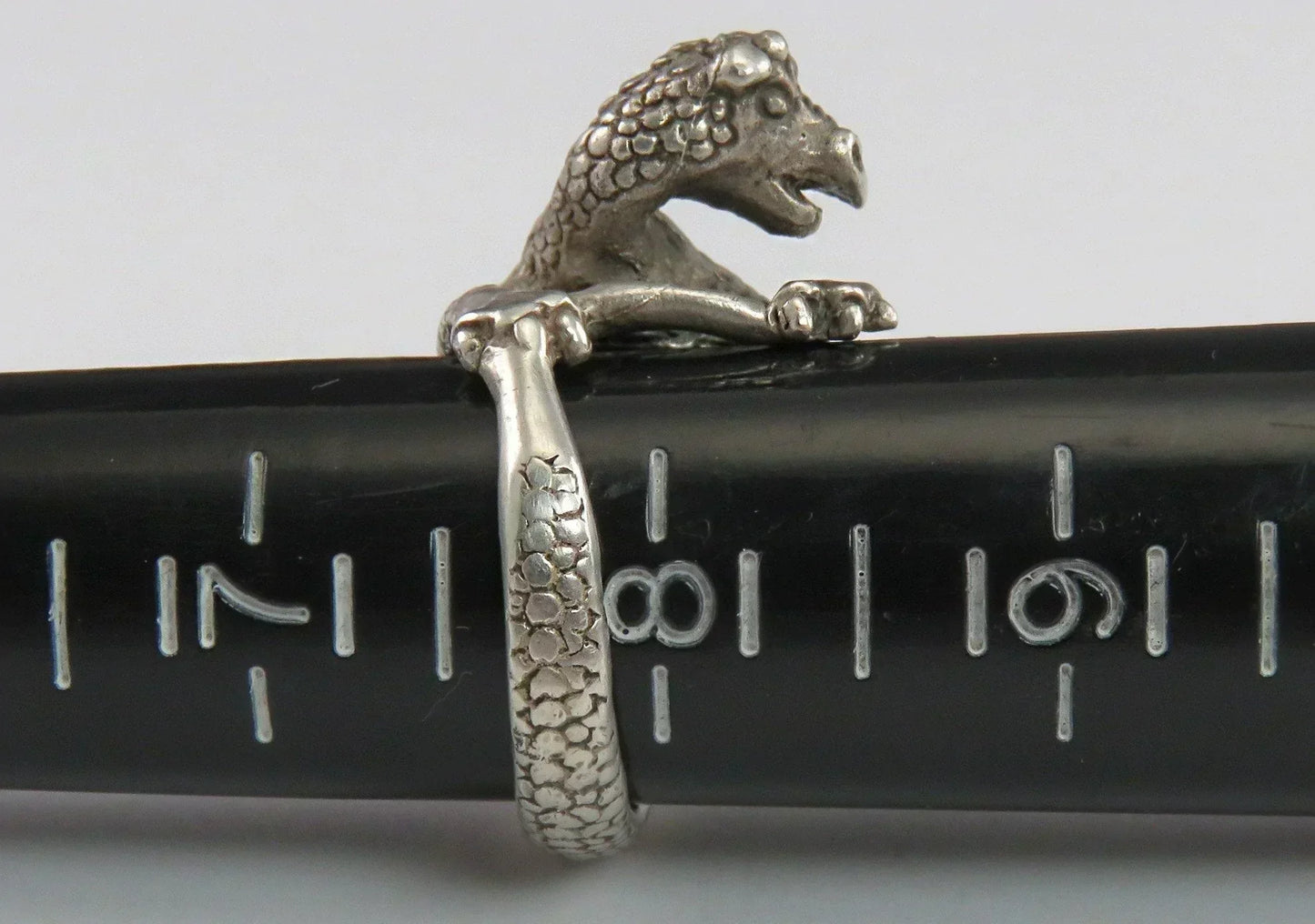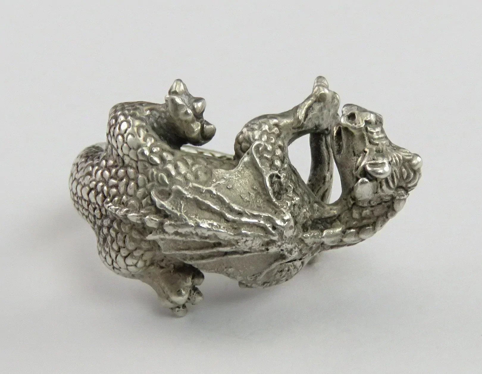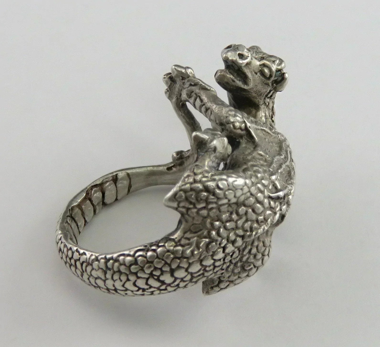 on both the dragon's back and belly. The dragon's tail stretches out and becomes the band of the ring, being gripped in the dragon's hands on the other side. The ring has a nice feeling of weight and substance on the hand, and is